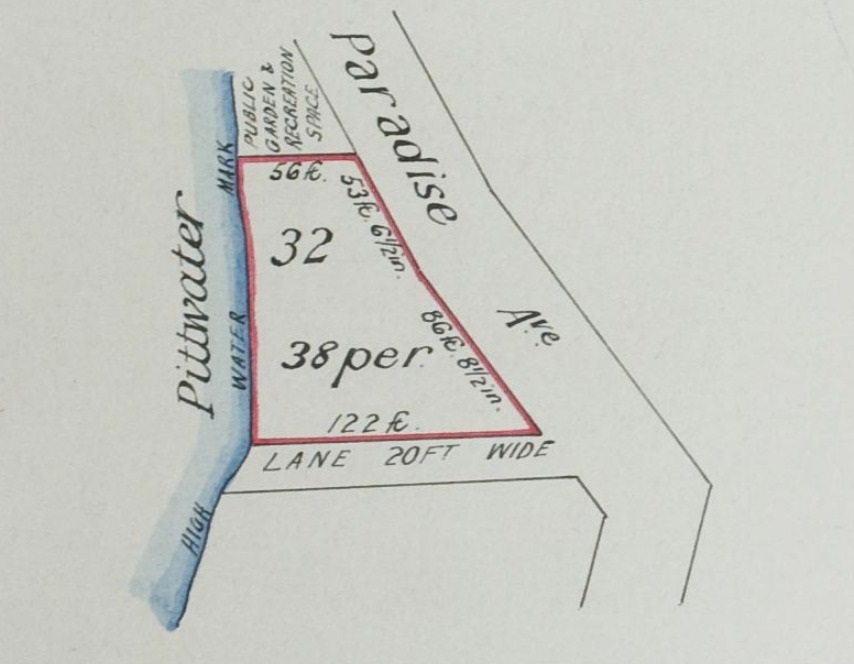 Showing 'Public Garden and Recreation Space'. NB: Lots 2, 7, 26 to 29 and 34, 35, 43 and 48 are already taken in the Powell land sales (above) and the laneways measuring 20 feet wide between the blocks on the waterfront at the south and north end of the beach to allow public access. Total area of the subdivision then becomes 12 acres and 23 perches
