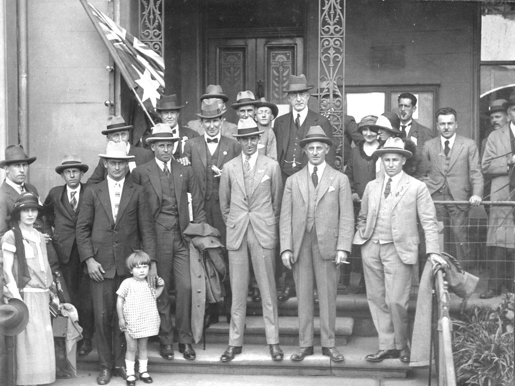 Winter, Andrew 'Boy' Charlton, Ernest Henry, Ossie Merrett and Dick Eve outside Manly Town Hall. Photo: Manly Library/Northern Beaches Library History Hub