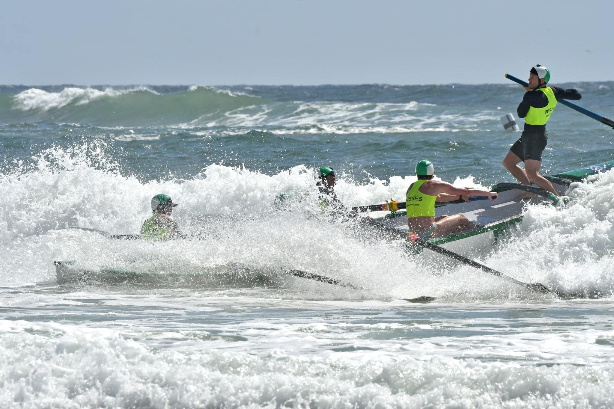 Friday morning the surf was bigger again. Magicseaweed had Nth Kirra at 2-3 ft, Bilinga at 5-7ft which was the same as Kurrawa. A gnarly first break, long gutter then a filthy outside bank – not very wide, but swells jacked up and dropped hard. Then, of course, there was the wind, 20-25 knots from the SE. A warmup and just one round for the open women ‘Thunder’, the race after ours only two boats finished out of five. The open men, ‘Hellfish’, got belted on the edge but still finished. Then the officials decided to wait until the tide came in, then waited again, then finally let us go home.