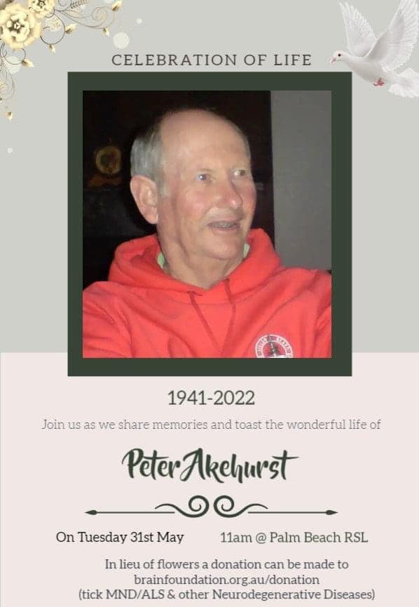There will be a celebration of Pete's life at Palm Beach RSL 11 am Tuesday 31 May 2022.