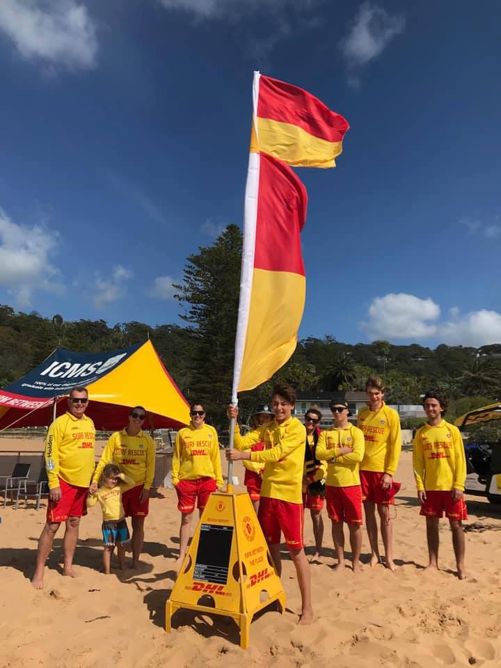 First flags up on Bilgola, Saturday September 28th, 2019. Windy but wonderful with a crew ready to serve! - Bilgola SLSC photo