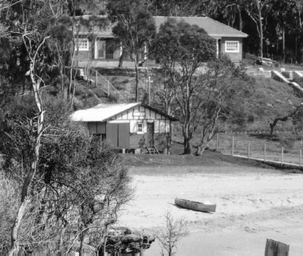 Palm Beach, January 1956 - note the structure next to the pavilion, this is a remnant of the Palm Beach SLSC clubhouse, finished in 1929, which was later used as a place to store surfboats and hired from the then Warringah Shire Council by