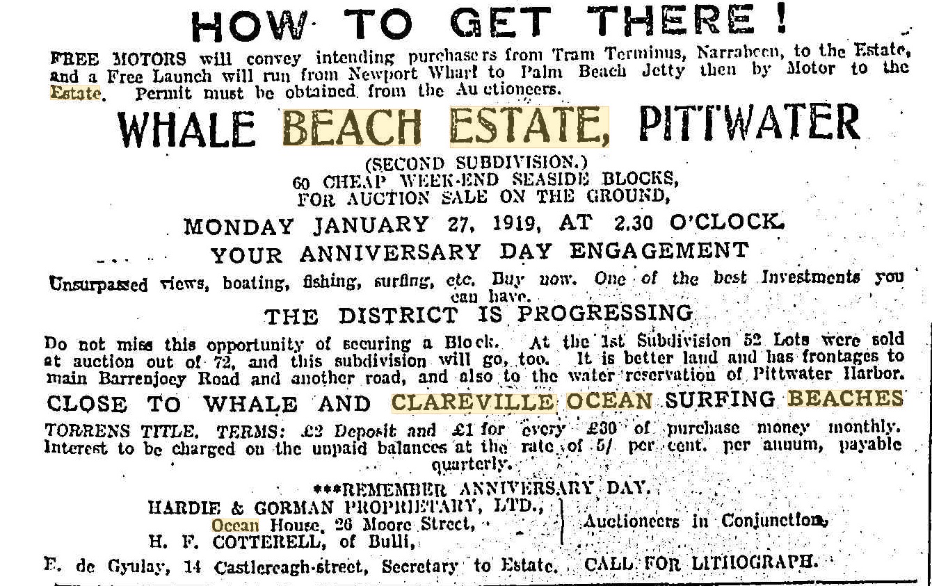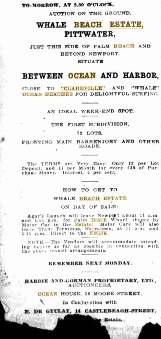 None of the larger sections sold apart from 30 acres on the estuary side which was purchased by Charles John Edward Forssberg, and registered as such in August 1900, and some acres on today's Whale Beach, purchased by soon to be Newport resident Trevor Jones: