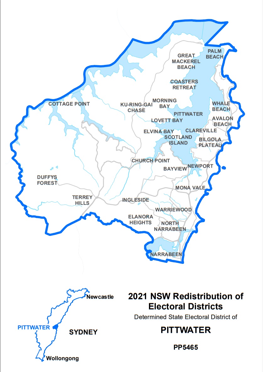 Electorate of Pittwater 2021 boundaries; map courtesy NSW Electoral Commission