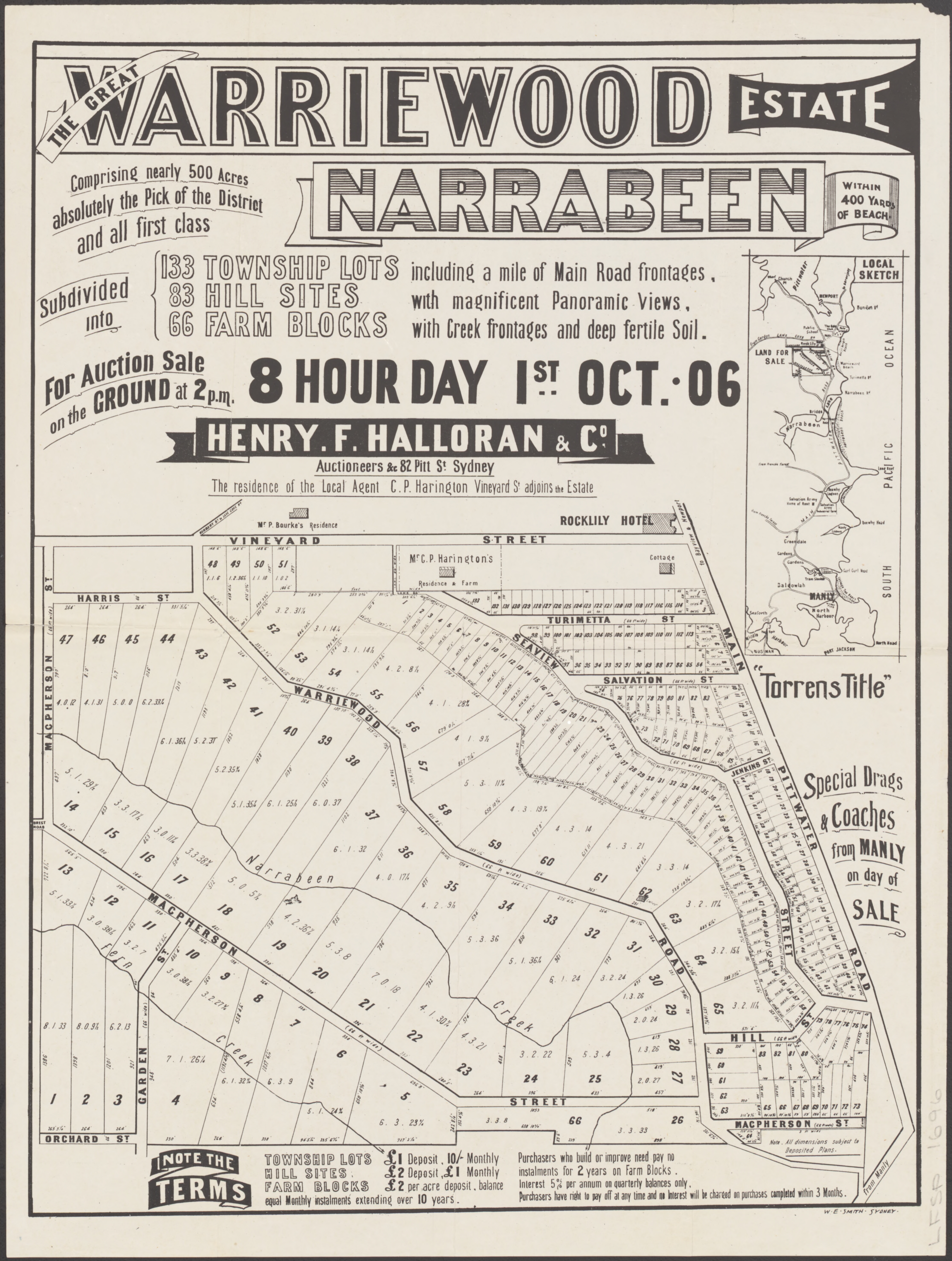 THAT MAGNIFICENT BLOCK of 400 acres delineated as James Napper's Grant on the Government plan of Parish of Narrabeen, ex the portions reserved by Government for Lighthouse and Public School purposes, IN SUBDIVISION, now in preparation by Mr. Licensed Surveyor, A. W. Stephen, into SUITABLE AREAS, to fit the requirements of YACHTSMEN, RETIRED GENTLEMEN, PUBLIC CATERERS, BUILDING SPECULATORS and others seeking DESIRABLE FREEHOLDS in a district growing in popularity every day, and soon likely to became a favorite suburb.