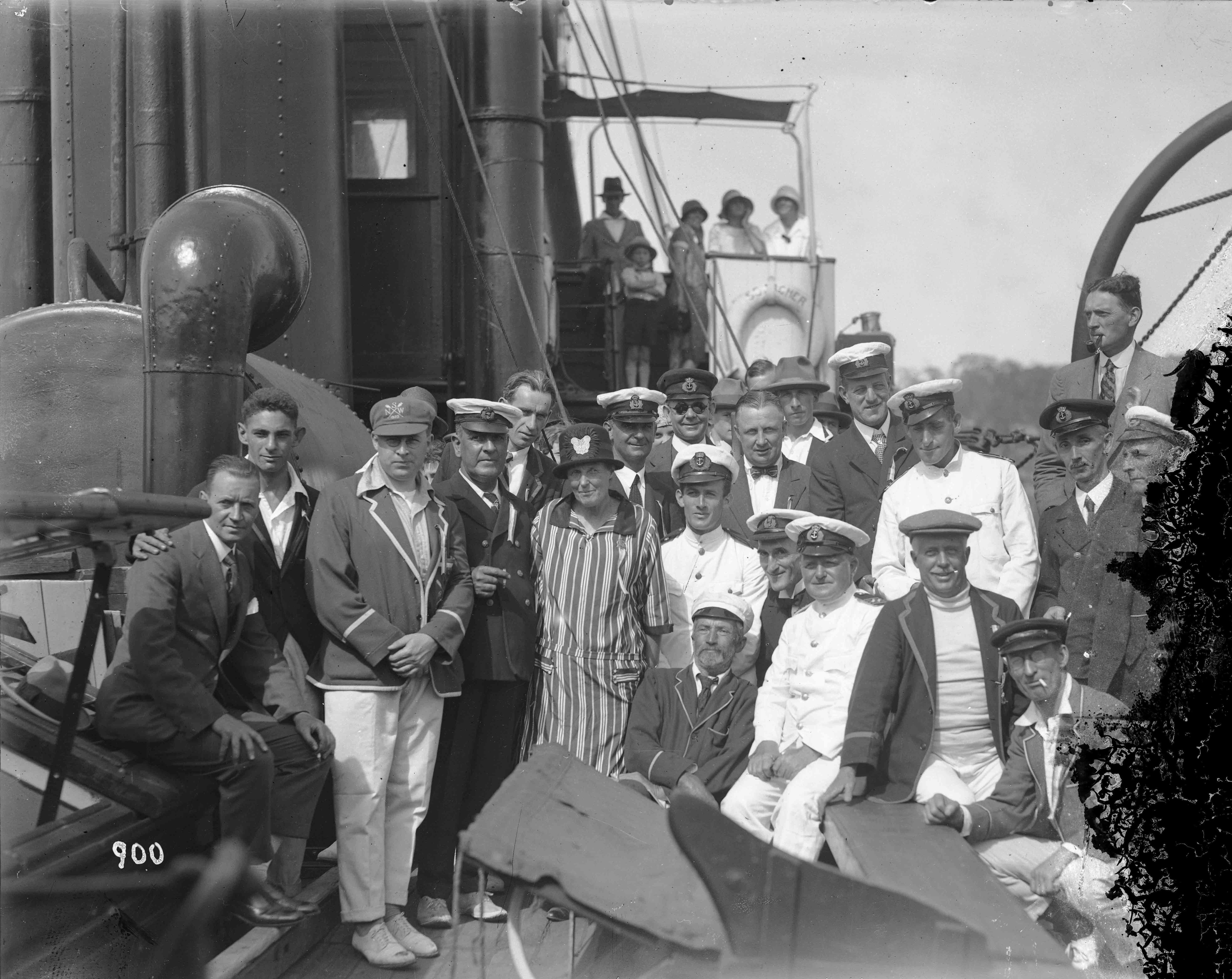 Crew and officials of the Pittwater Regatta on NAMOI, photo is part of the Australian National Maritime Museum’s William Hall collection, Object no. 00012165