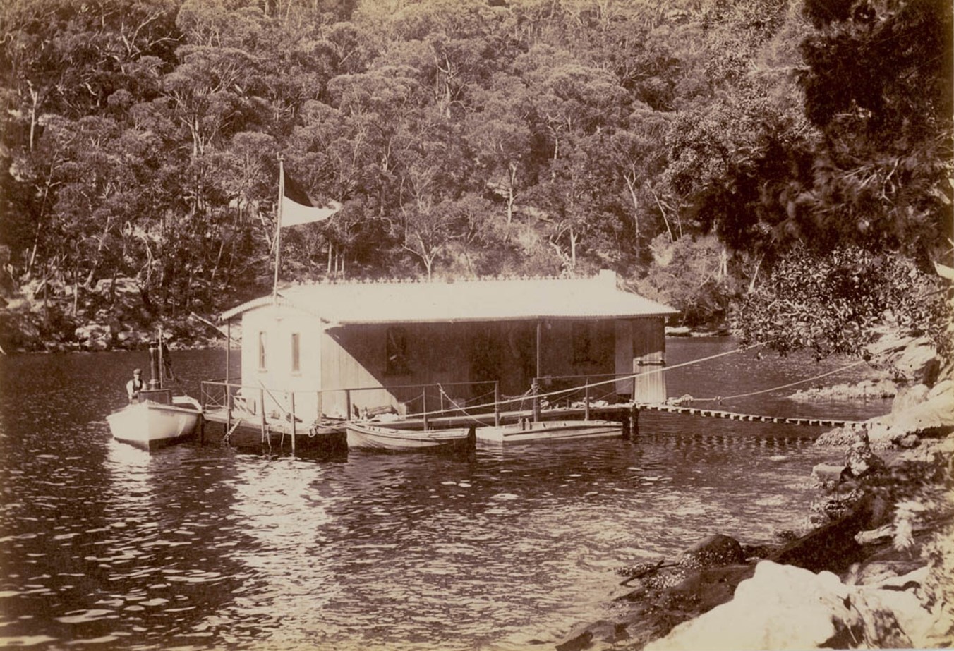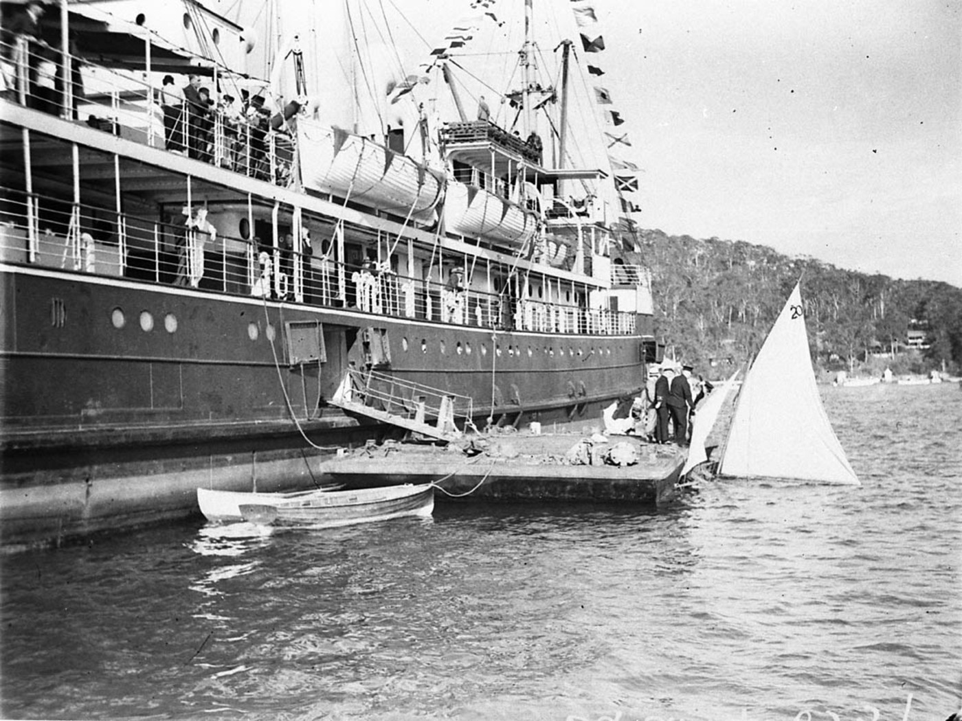 Flagship "Gwydir" at Pittwater Regatta, showing boarding pontoon moored beside, Item: hood_06537h, courtesy the State Library of New South Wales.