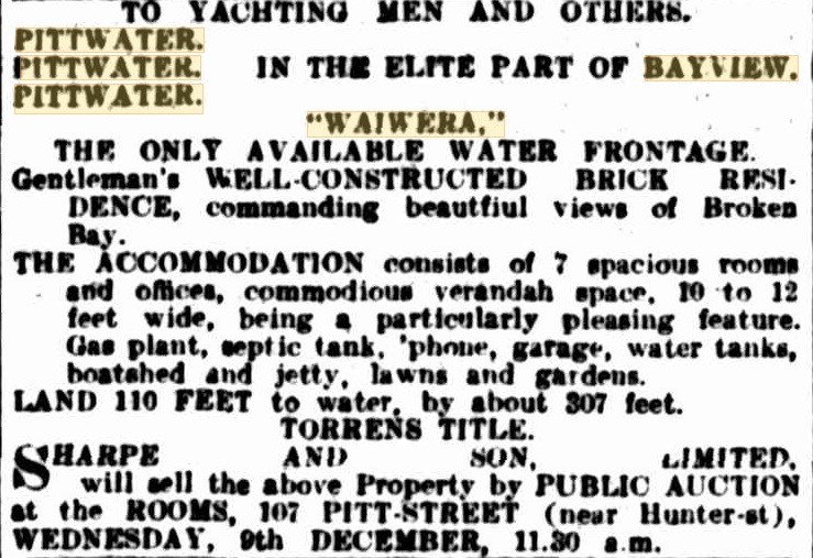 RICHARDSON and WRENCH LTD will offer the above Property at PUBLIC AUCTION in the Rooms 92 Pitt street, on FRIDAY, 21st NOVEMBER at 11 a m (618) Advertising (1924, November 8). The Sydney Morning Herald (NSW : 1842 - 1954), p. 21. Retrieved from http://nla.gov.au/nla.news-article16172099