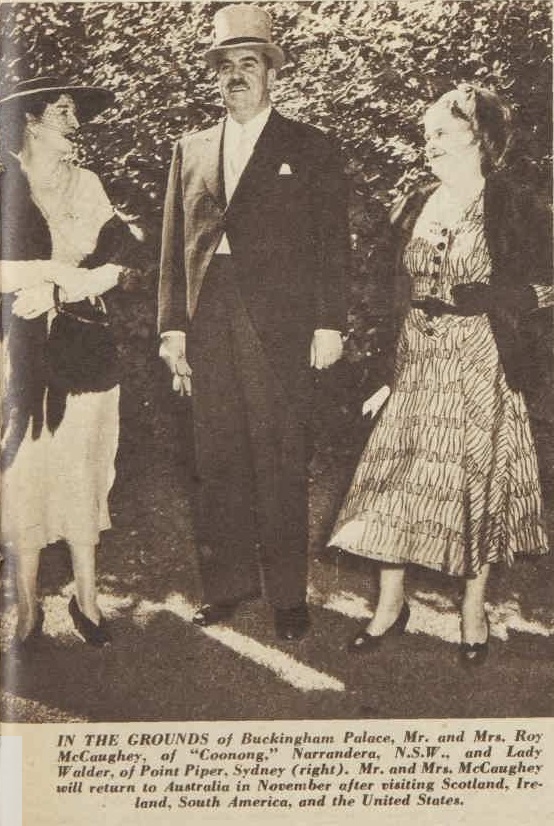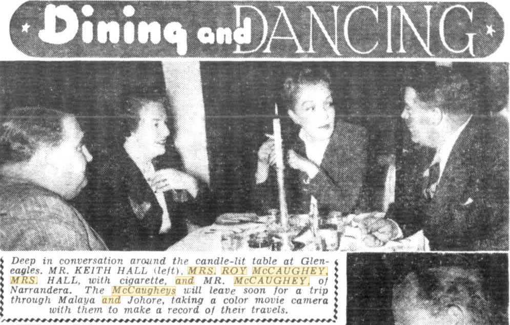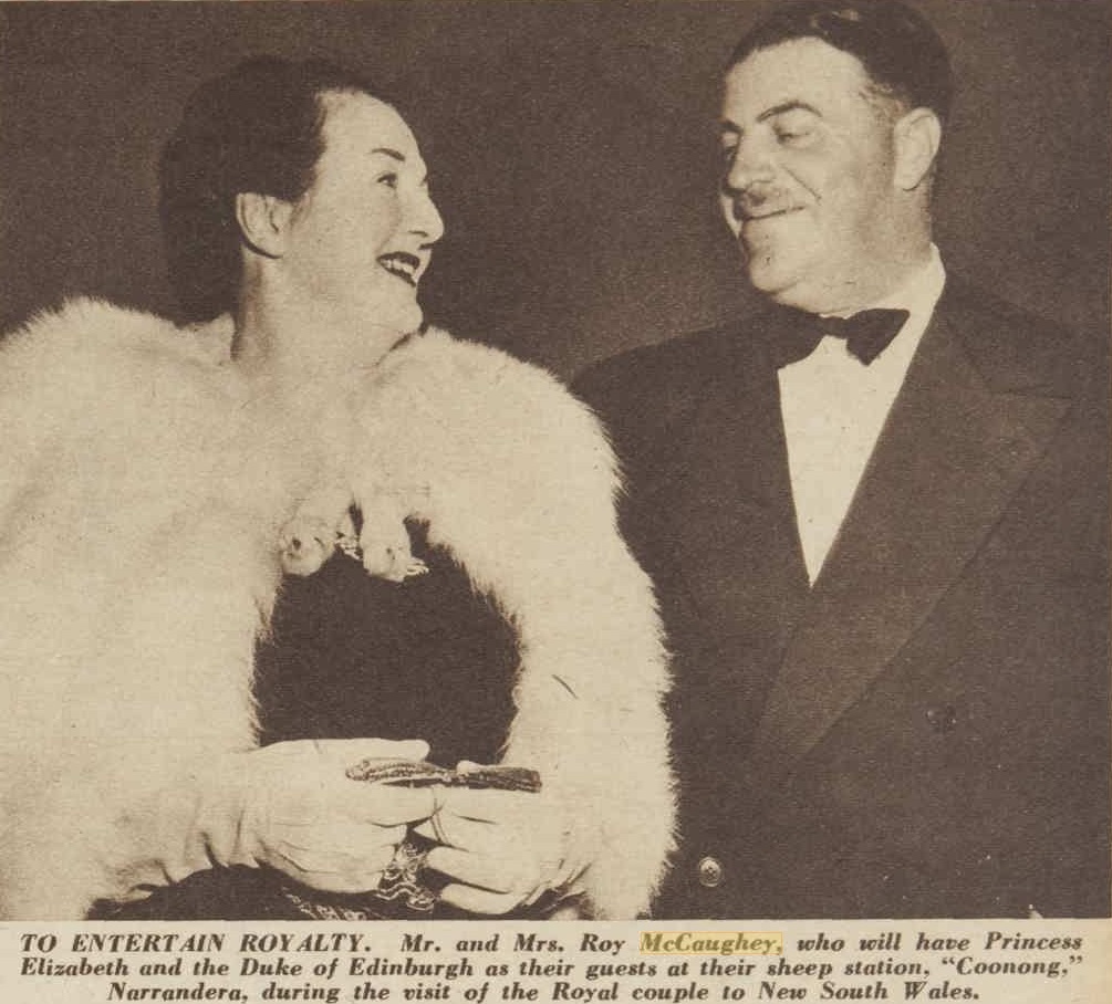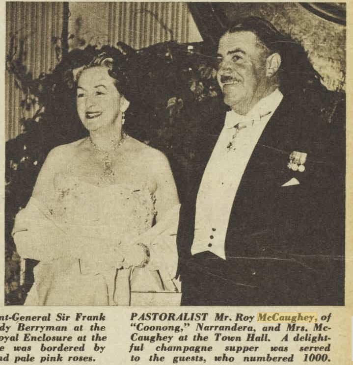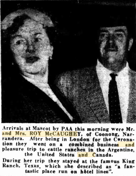 MR. AND MRS. ROY McCAUGHEY shared the celebration of their ninth wedding anniversary with their three wins-for short-horn cattle-at the R.A.S., when they attended the Short-horn Society's buffet dinner at the Pickwick Club last night. Mr. and Mrs. McCaughey will leave in the Orion on April 11 for London to attend the coronation; during their absence Miss Lorna Lippman, of Potts Point, will be hostess at their home Coonong, Narrandera. Social News And Gossip (1953, March 29). The Sunday Herald (Sydney, NSW : 1949 - 1953), p. 22. Retrieved from http://nla.gov.au/nla.news-article18503779