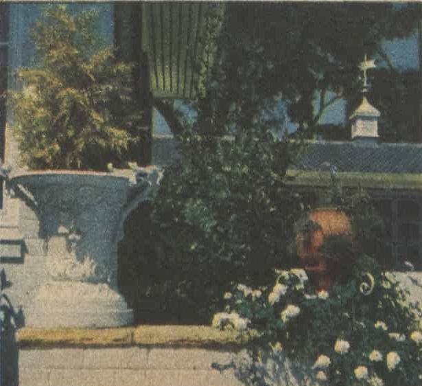PAVED COURTYARD of sandstone (above) leads up to the entrance of "Hopton Lodge" the home of Mr. and Mrs. Bill Northam at Bayview, N.S.W. The house, which is painted white with grey shutters and a grey tiled roof, is set among beautiful gardens which are Mrs. Northam pride and joy. Other side of house looks over Pittwater.