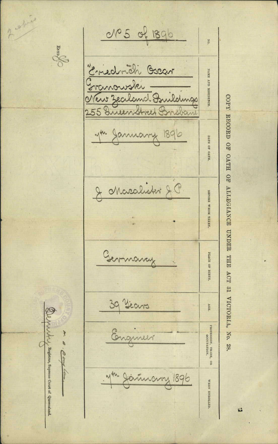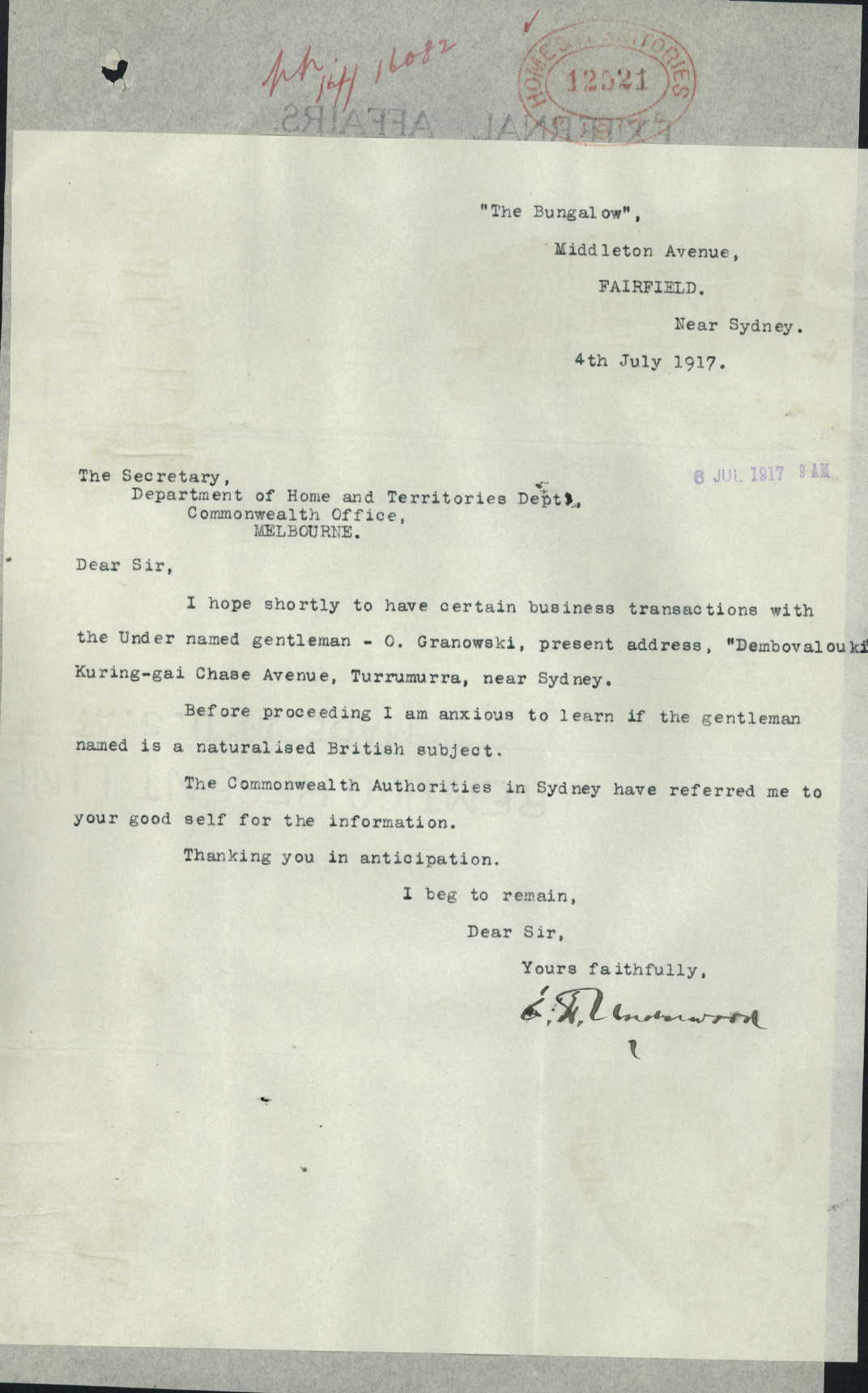 Property Transferred from Oscar Granowski (deatils about him below) to Annie Isobel Forsyth, wife of George Alfred Forsyth of Bayview, Gentleman – dated March 20th, 1918 – he passed away in 1923 – and was a relative of (uncle) of Annie Forsyth Wyatt
