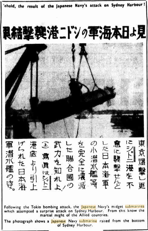 An explanatory note underneath the photograph says: "Following the Tokio bombing attack, the Japanese Navy's midget submarines attempted a surprise attack on Sydney Harbor. "From this know the martial might of the Allied countries. The photograph shows a Japanese Navy submarine raised from the bottom of Sydney Harbor."