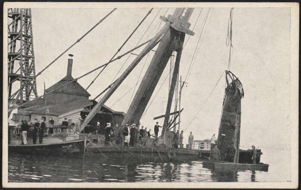 The bow of the Japanese submarine as it was raised from the Harbour yesterday, showing the two torpedo tubes. The torpedo on the left was projecting about three feet when the steel ropes were made fast for the lift, but it slipped back as the submarine was swung vertically by the crane. (Story on Page. 5.) TORPEDOES IN BOW OF SUBMARINE (1942, June 5). The Sydney Morning Herald (NSW : 1842 - 1954), p. 7. Retrieved from http://nla.gov.au/nla.news-article17798752