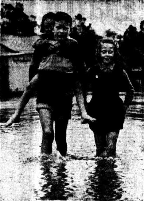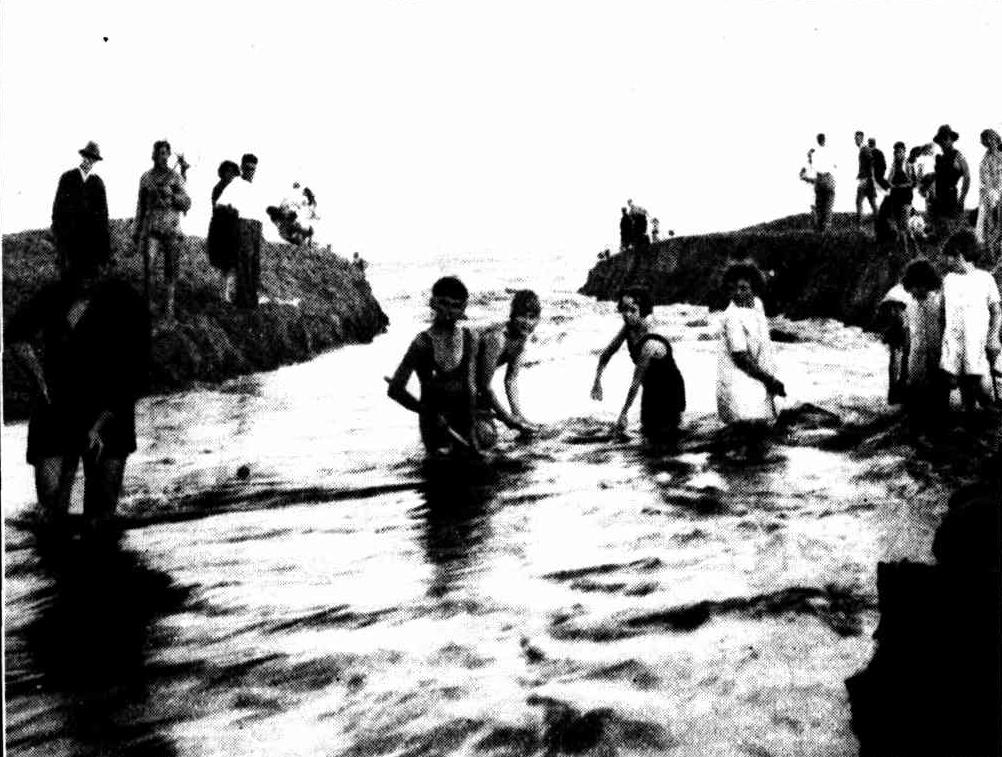 In spite of the strong north-east wind and driving rain which prevailed on Saturday, the beach at North Narrabeen was the scene of much activity. About 20 workers and a hundred spectators were gathered there for the purpose of assisting in the witnessing of cutting of a channel through the sand to release the surplus waters of the lake, by allowing them to flow into the sea.