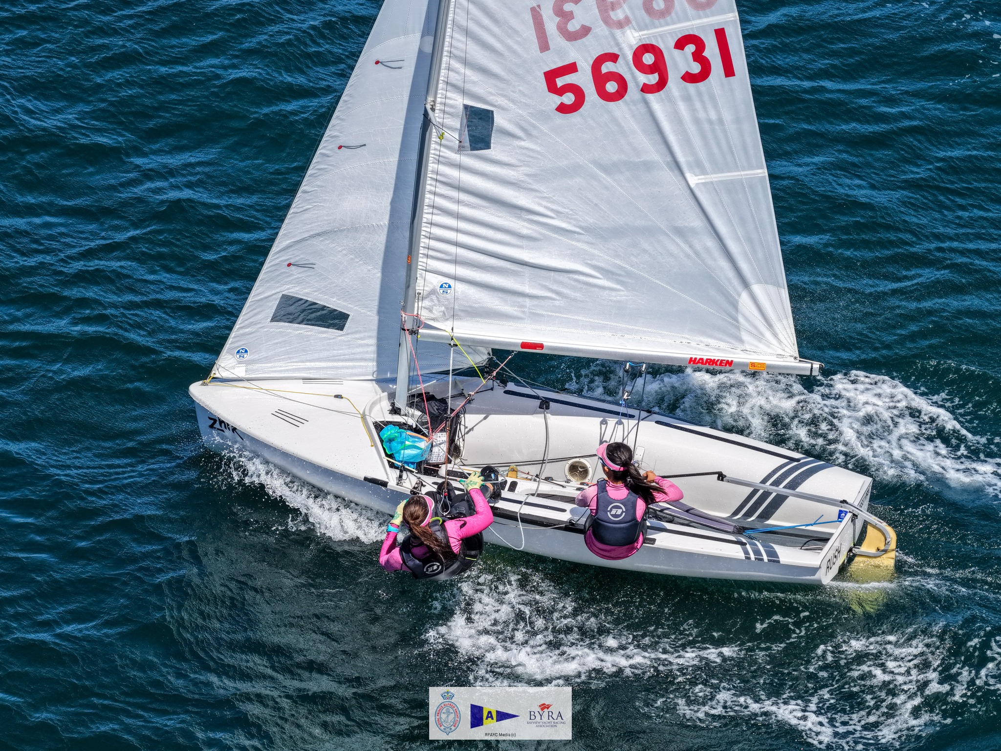 The 29er and 420 fleets enjoyed excellent planning conditions, with tight racing throughout the fleet as crews pushed hard upwind and downwind in the lively breeze.