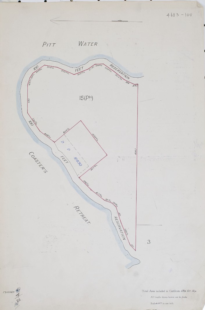 It is described as commencing at a marked tree in a small bay at Pitt Water, and bounded on the west by a line north 22 chains, on the north by a line east 25 chains to Pitt Water, and on the south-east and all other sides by that water to the marked tree