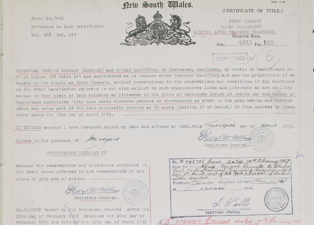 Frederick James Jackson 43 acres 1 rood 1 3/4 perches at Basin & Coasters Retreat in Pitt Water in Shire Warringah Parish Broken Bay County Cumberland Volume 2256 Folio 167