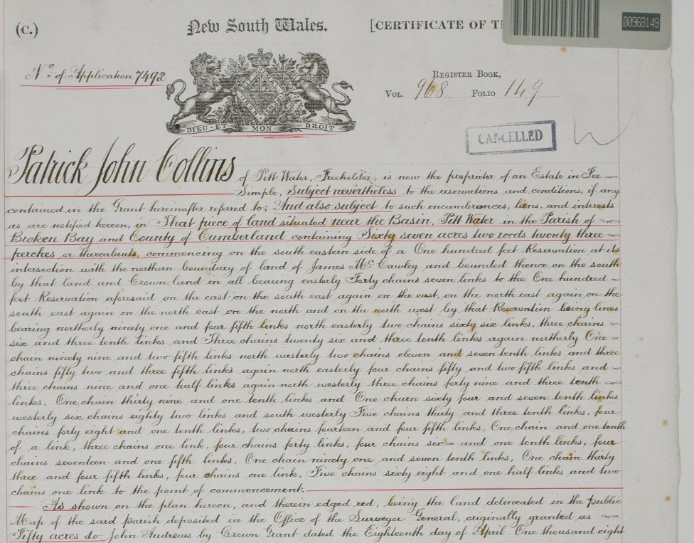 On October 10th 1872 Andrews’ grant was conveyed to John Collins in exchange for a smaller block with a cottage on it at Careel Bay. A query arose later as to whether the Shaws had some legal right to the land, but this was discounted by the authorities, on Mrs Collins’ statement. [2.]