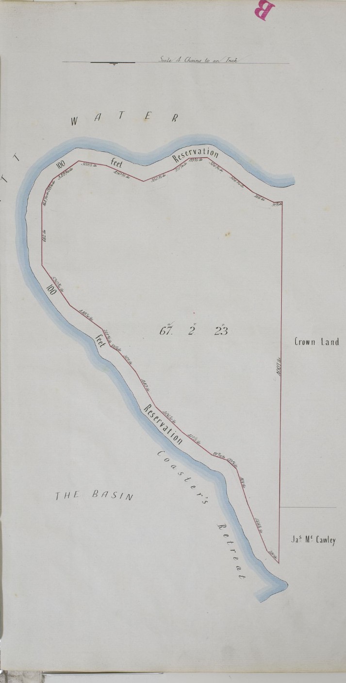 The lands of The Basin and Coaster's Retreat changing hands begins prior to that though. In 1833 Martin Burke applied for a grant of land at The Basin, which then comprised a small flat of land of about four acres and the tiered hillside where Chinese Market gardeners had constructed terraces to hold growing produce.