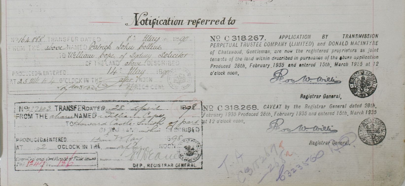 Howard Castle-Smith, of Woolwich and Sydney; overdue rates, £80 8s. 10d.; land, lot 1, being part of portion 15, Coasters Retreat, Broken Bay. OVERDUE RATES.—SHIRE OF WARRINGAH.—Land to be Sold (1943, June 25). Government Gazette of the State of New South Wales (Sydney, NSW : 1901 - 2001), p. 1098. Retrieved from http://nla.gov.au/nla.news-article222037688