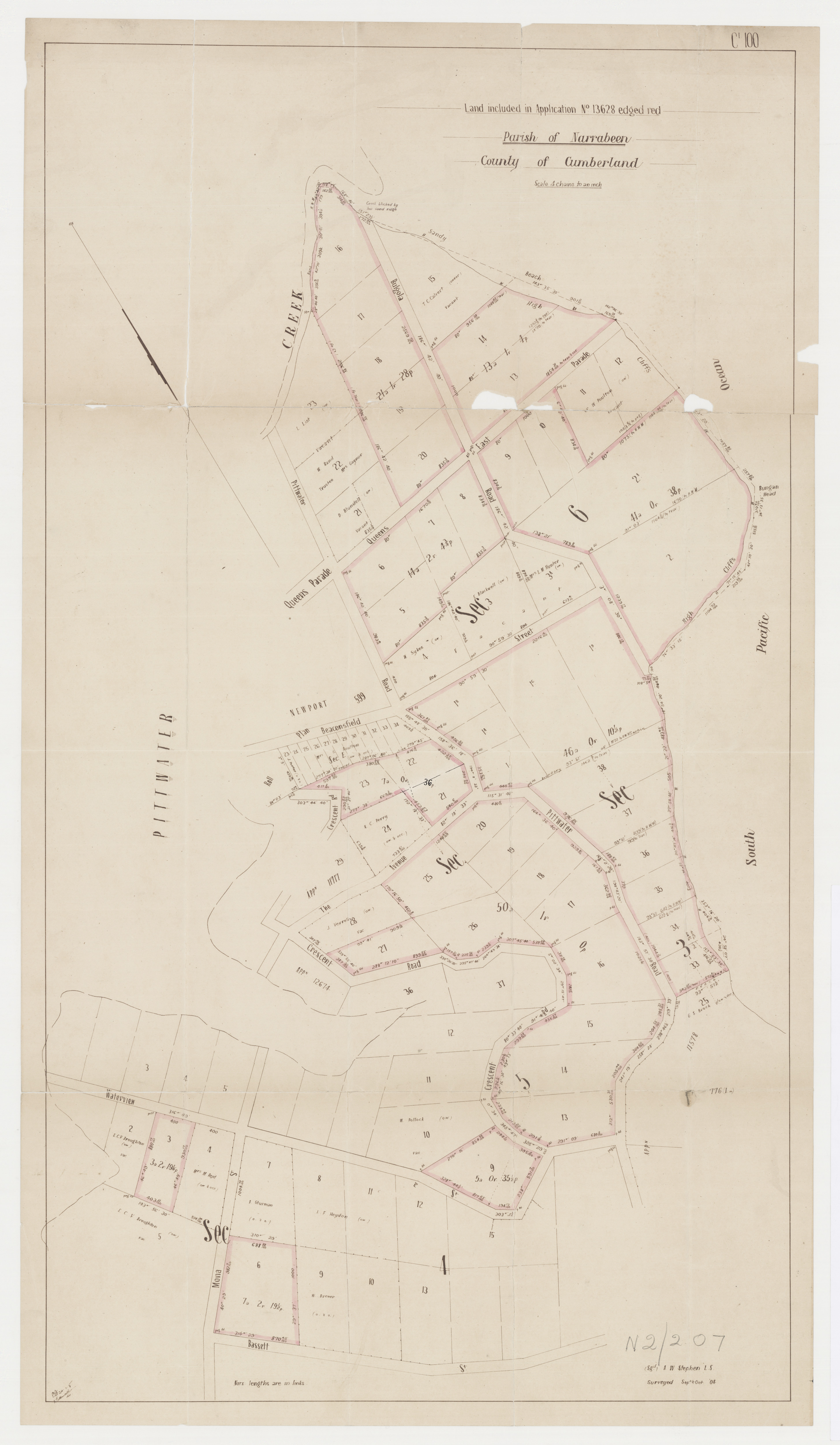 No. 73. County of Cumberland, parish of Narrabeen, area about 7 acres. The Crown Lands within the following boundaries : Commencing on the southern shore of Pitt Water, at the junction of the western margin of Wimererremy Swamp; and bounded thence on the west, by the margin of that swamp forming the eastern boundary of P. Patilla's, now B. Crew's, 80 acres, bearing southerly to the intersection of the prolongation of the north-east boundary of G. M'Intosh's 43 acres 2 roods; thence bounded on the south-west by that prolongation and that north-cast boundary bearing south-easterly to the western boundary of Robert Campbell's 700 acres ; and thence by part of that boundary and the southern shore of Pitt Water aforesaid northerly and north-westerly, to the point of commencement. RESERVES FROM SALE FOR CAMPING AND OTHER PUBLIC PURPOSES. (1881, November 28). New South Wales Government Gazette (Sydney, NSW : 1832 - 1900), p. 6134. Retrieved from http://nla.gov.au/nla.news-article221697390