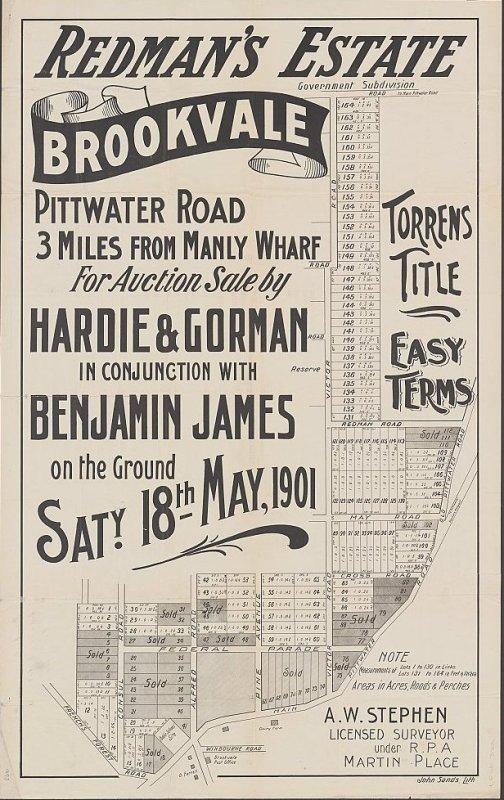 Right: Hardie & Gorman Pty. Ltd. Redman's Estate, Brookvale [cartographic material] : Pittwater Road, 3 miles from Manly Wharf : for auction sale 1901. MAP Folder 29, LFSP 382.Courtesy National Library of Australia