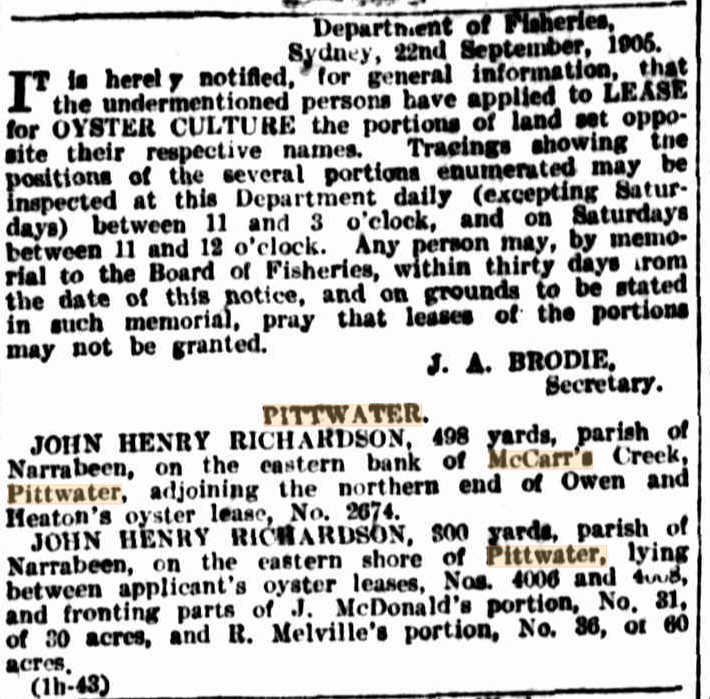 Parish Narrabeen, county Cumberland; extension of term of Special Lease 1925-8, Metropolitan, for jetty, slip, pier, bath and boatshed. Land applied for—17.9 perches below high-water mark, McCarrs Creek, Pittwater, just below Church Point. Applicant—John James McWilliam. Objections may be lodged at the Local Land Board Office, Sydney. APPLICATIONS FOR LEASES FOR SPECIAL PURPOSES. (1948, January 9). Government Gazette of the State of New South Wales (Sydney, NSW : 1901 - 2001), p. 48. Retrieved from http://nla.gov.au/nla.news-article225374021