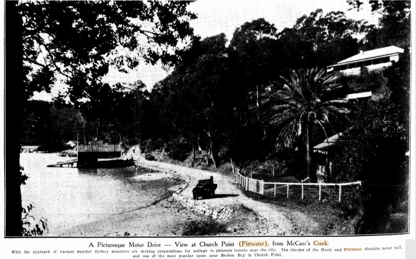 With the approach of warmer weather Sydney motorists are making preparations for outings to pleasure resorts near the city. The charms of the Manly and Pittwater districts and one of the most popular spots near Broken Bay is Church Point. MOTORING (1929, August 28). Sydney Mail (NSW : 1912 - 1938), p. 45. Retrieved from http://nla.gov.au/nla.news-article160395048
