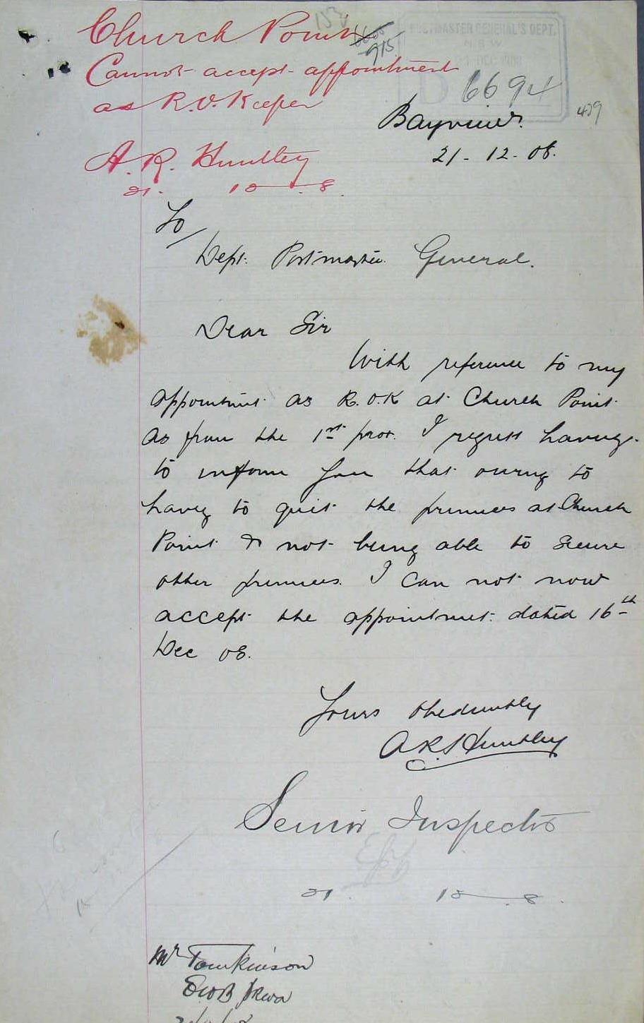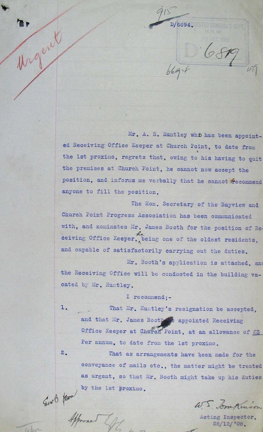 From National Archives of Australia's 1907-1912 records box for Church Point Post Office;