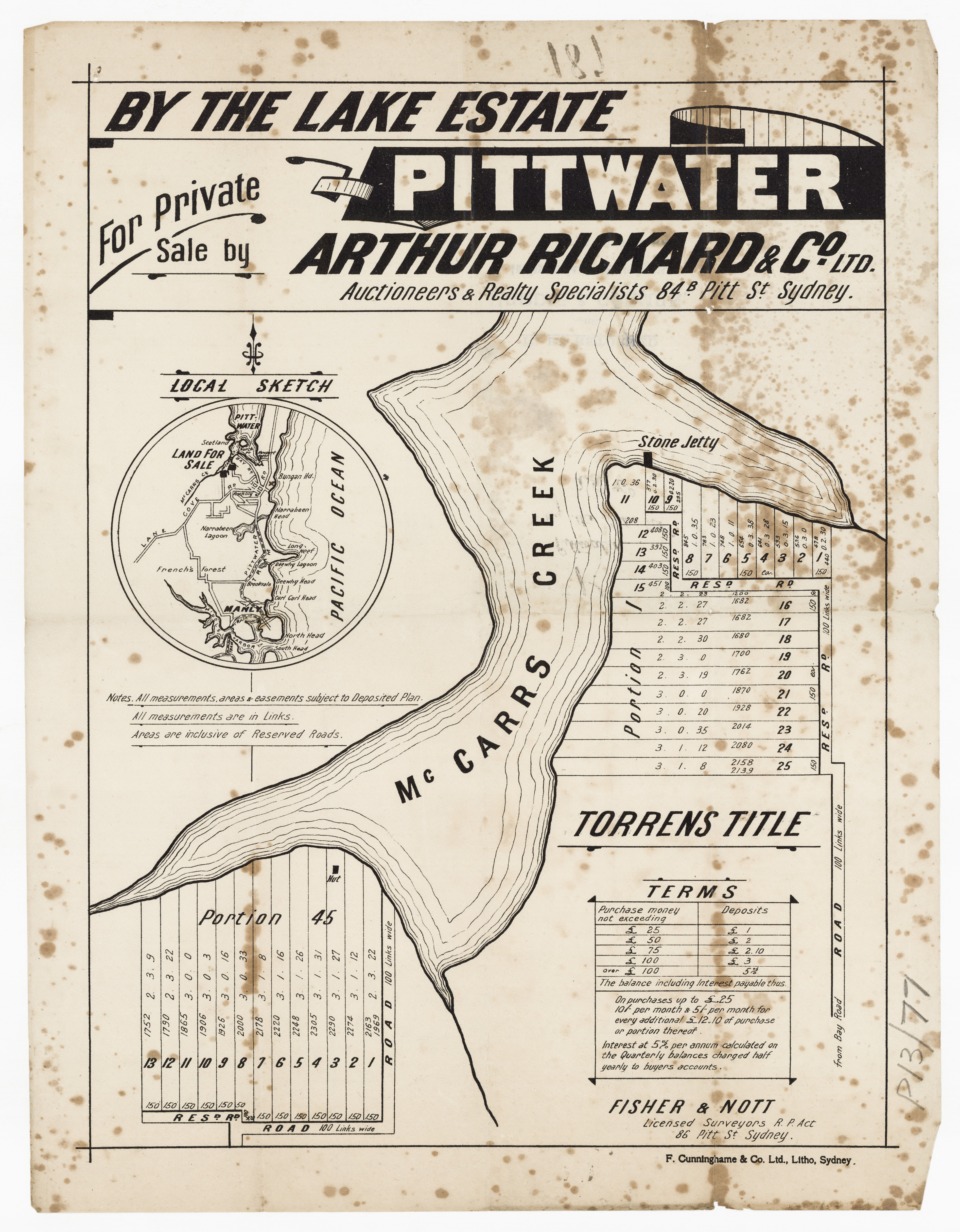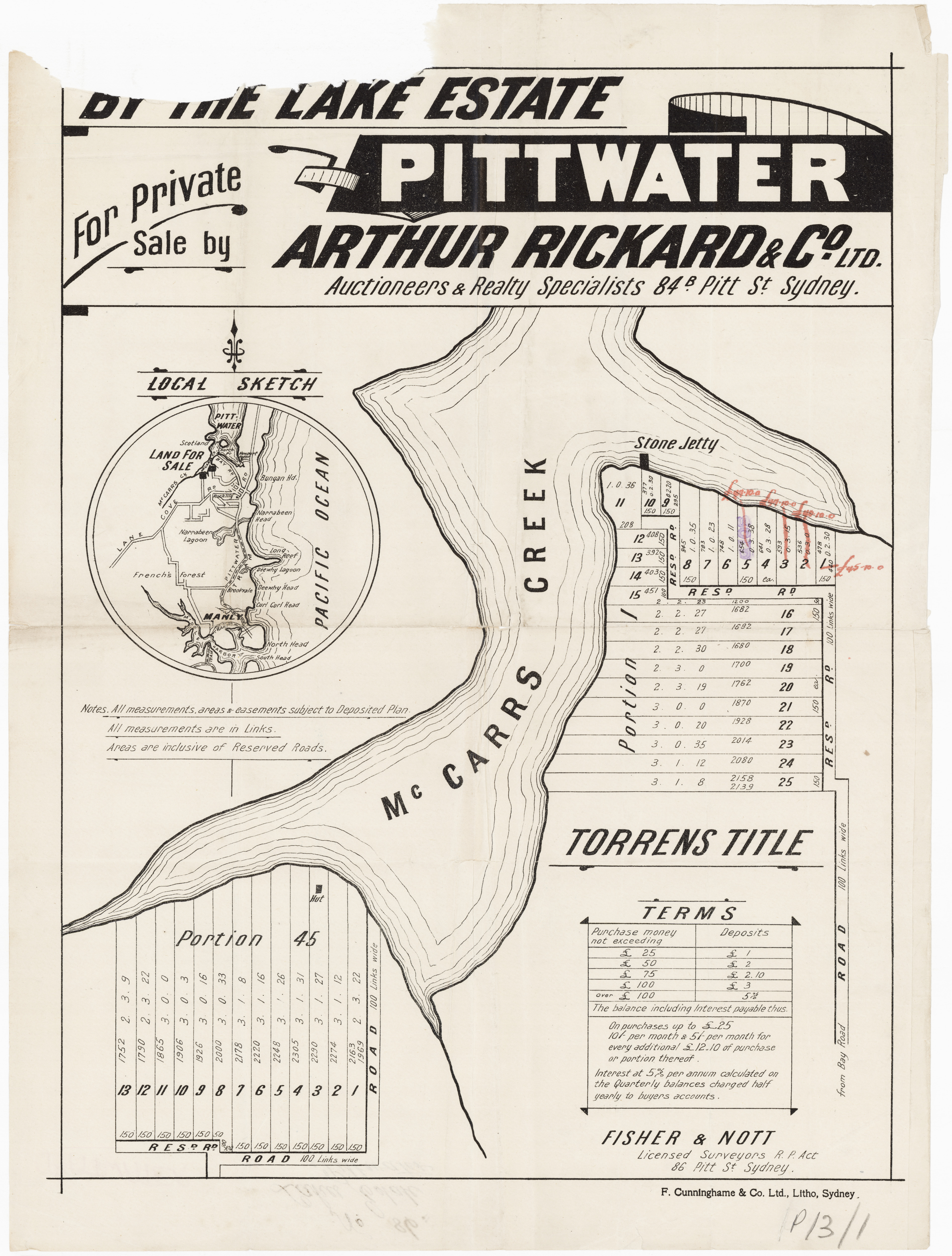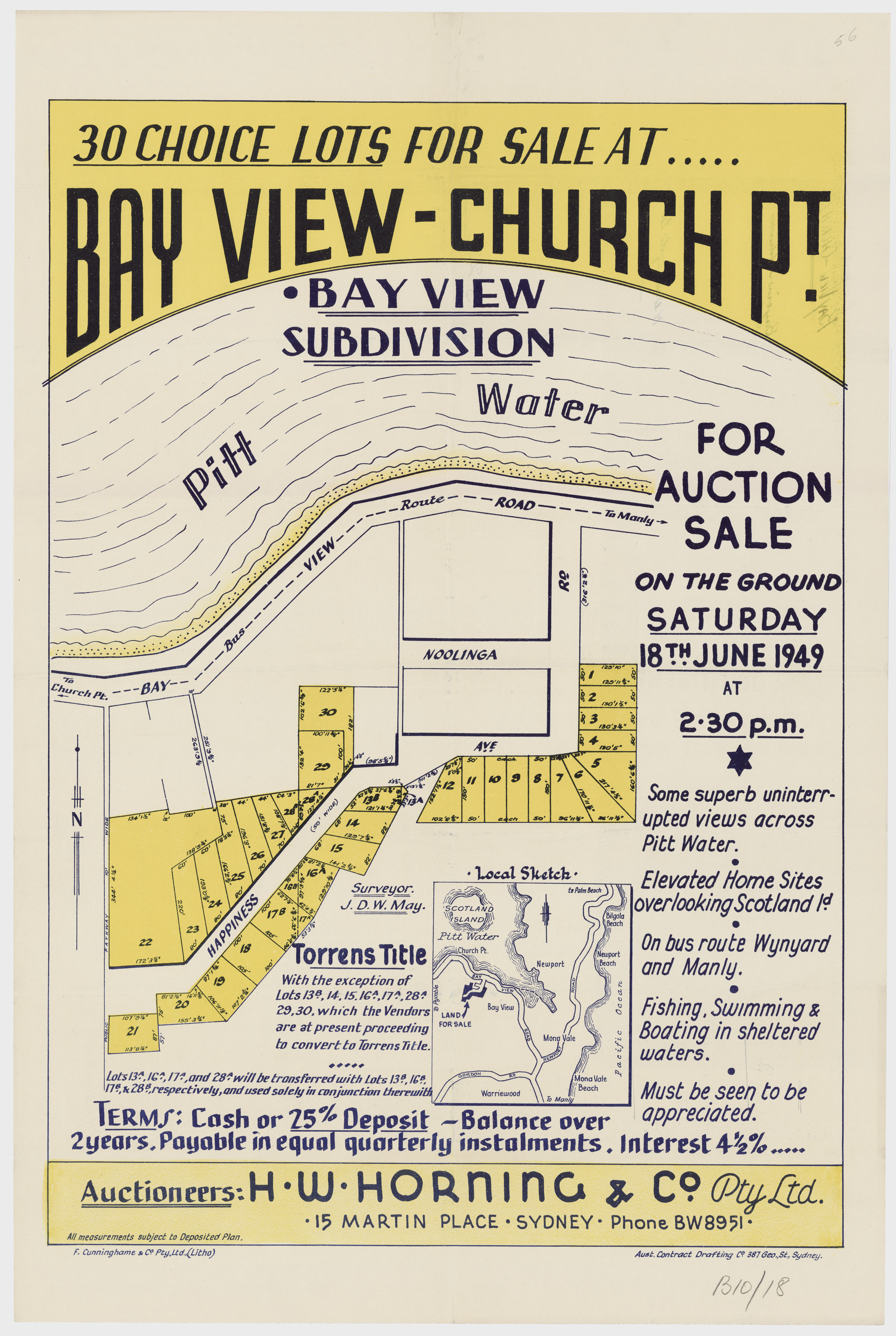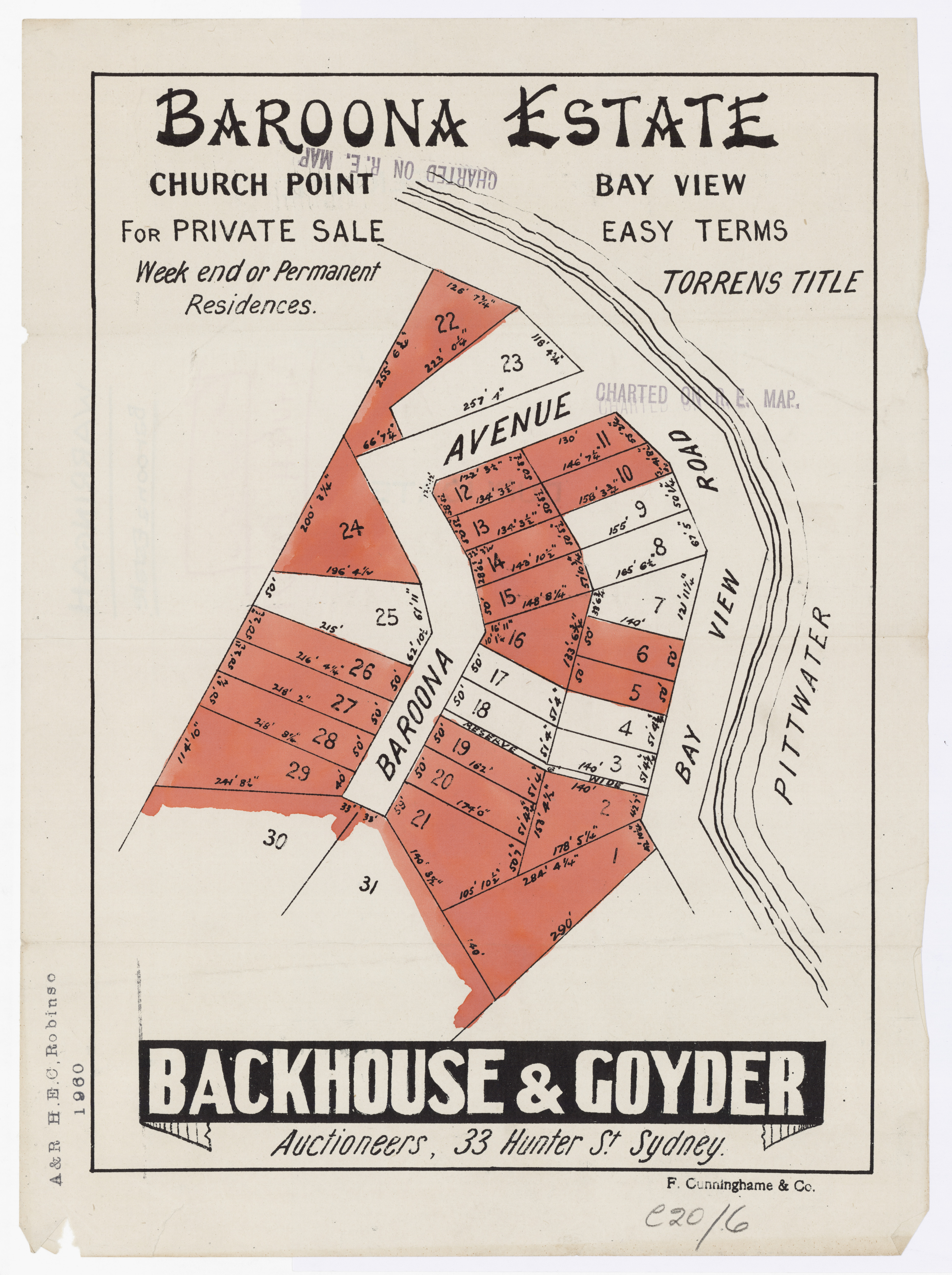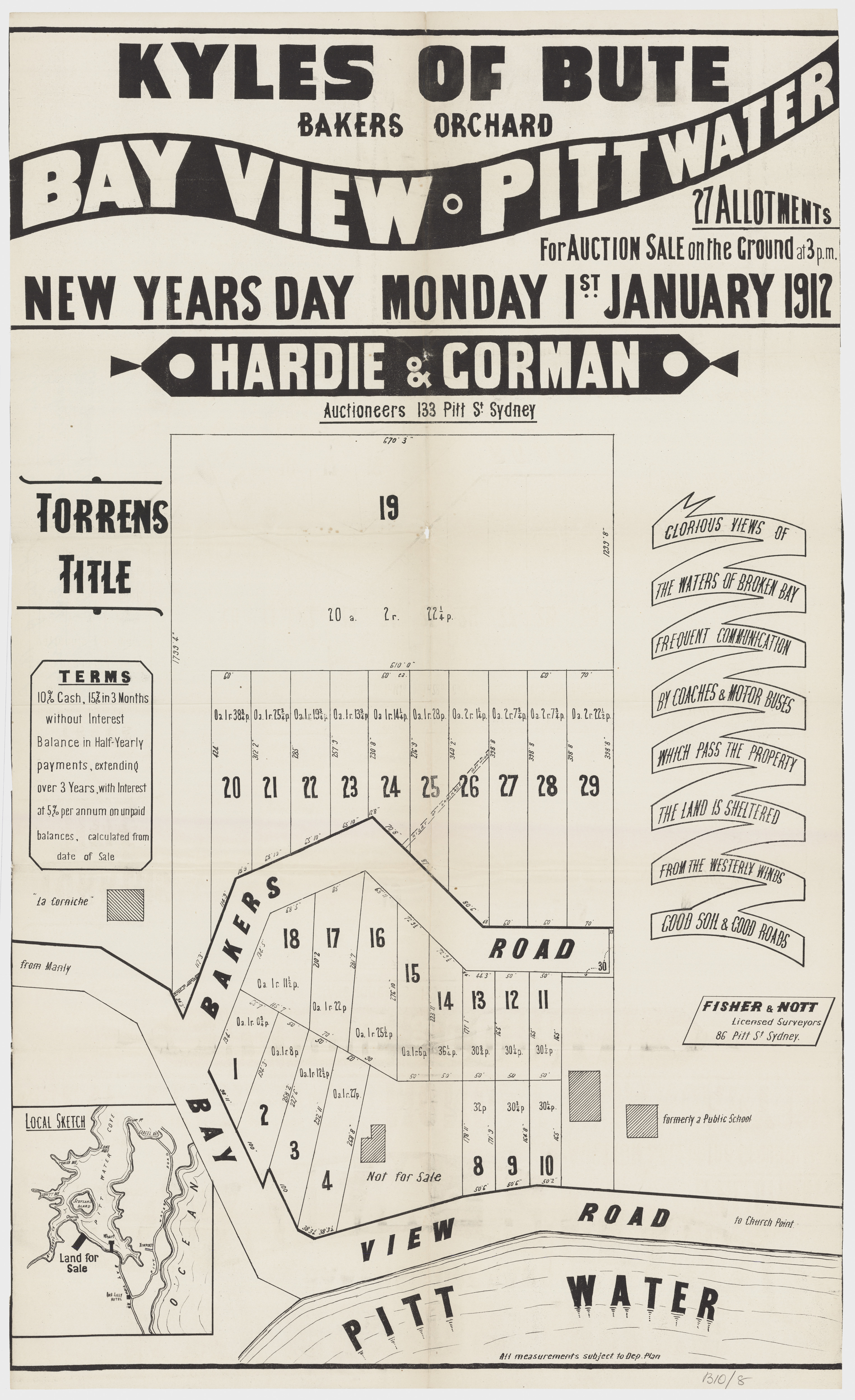 BY ORDER OF THE EXECUTORS THE ESTATE OF THE LATE MR. WILLIAM JOSEPH BAKER. ONE OF THE MOST CHARMING SPOTS AROUND SYDNEY. CHURCH POINT, PITTWATER. A pleasant Motor or Coach drive from Manly, through delightful and varied Scenery. SPLENDID SUBDIVISION BLOCK OF ABOUT 30 ACRES, PRACTICALLY A WATER FRONTAGE, with LARGE FRONTAGE to the MAIN ROAD, adjoining La Corniche, the well-known Accommodation House of Mons. Rainaud, and the old Public School, now the Property of Mr. Lesslie. The LAND is Fenced, and the improvements comprise old W.B. COTTAGE, with Iron Roof, containing Verandah, Hall, 6 Rooms, Kitchen, 2 Room's off, detached Stables, Shed, etc. There is an old Orchard of various Fruit Trees, and the Land is mostly nicely grassed, and divided into Paddocks. The Property is let on Lease till 1st July out to Mons. Rainaud. THE VIEWS ARE SUPERB, and embrace Pittwater, Scotland Island, Newport, etc