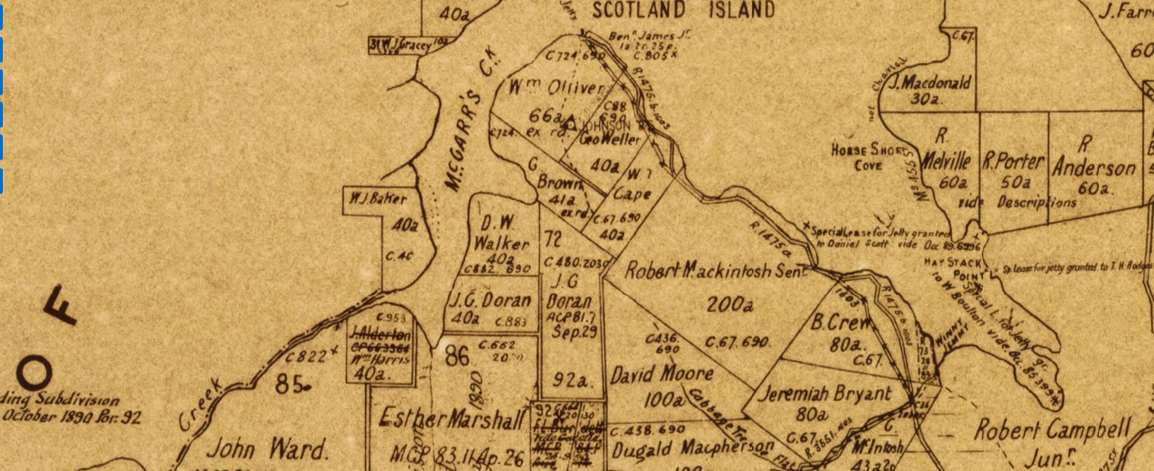 The land was transferred to E. A. Macpherson on October 23rd 1888, which is why a photo of the road out to that point from the members of the Macpherson family exists. The land faced McCarr's Creek and then ran around the corner to the head of Brown's Bay.