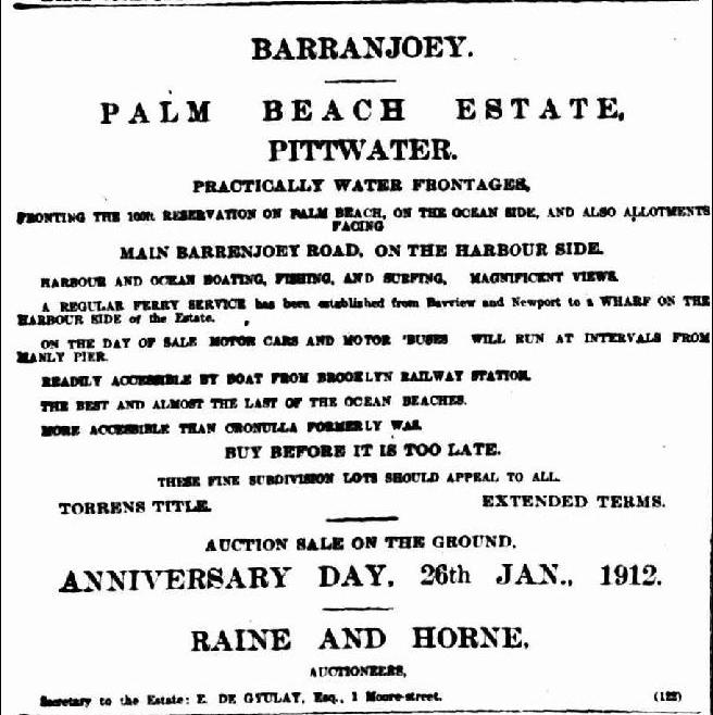 Applicant: THE BARRANJOEY COMPANY, Limited (S.L.), 11.7, Metropolitan). Locality: Pittwater, Parish of Narrabeen, County of Cumberland. Area: 32 perches; for wharf. Advertising (1911, November 18). The Sydney Morning Herald (NSW : 1842 - 1954), p. 11. Retrieved from http://nla.gov.au/nla.news-article15290140