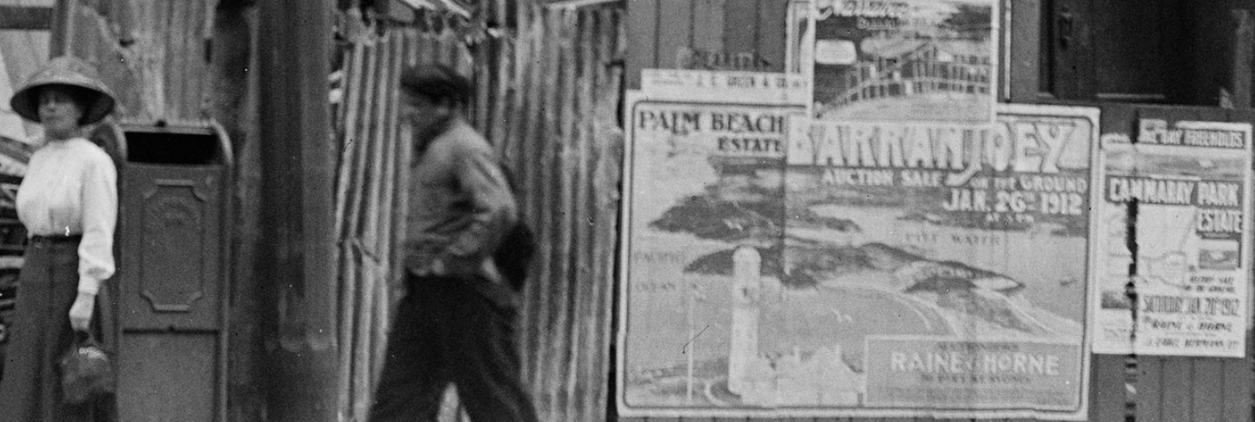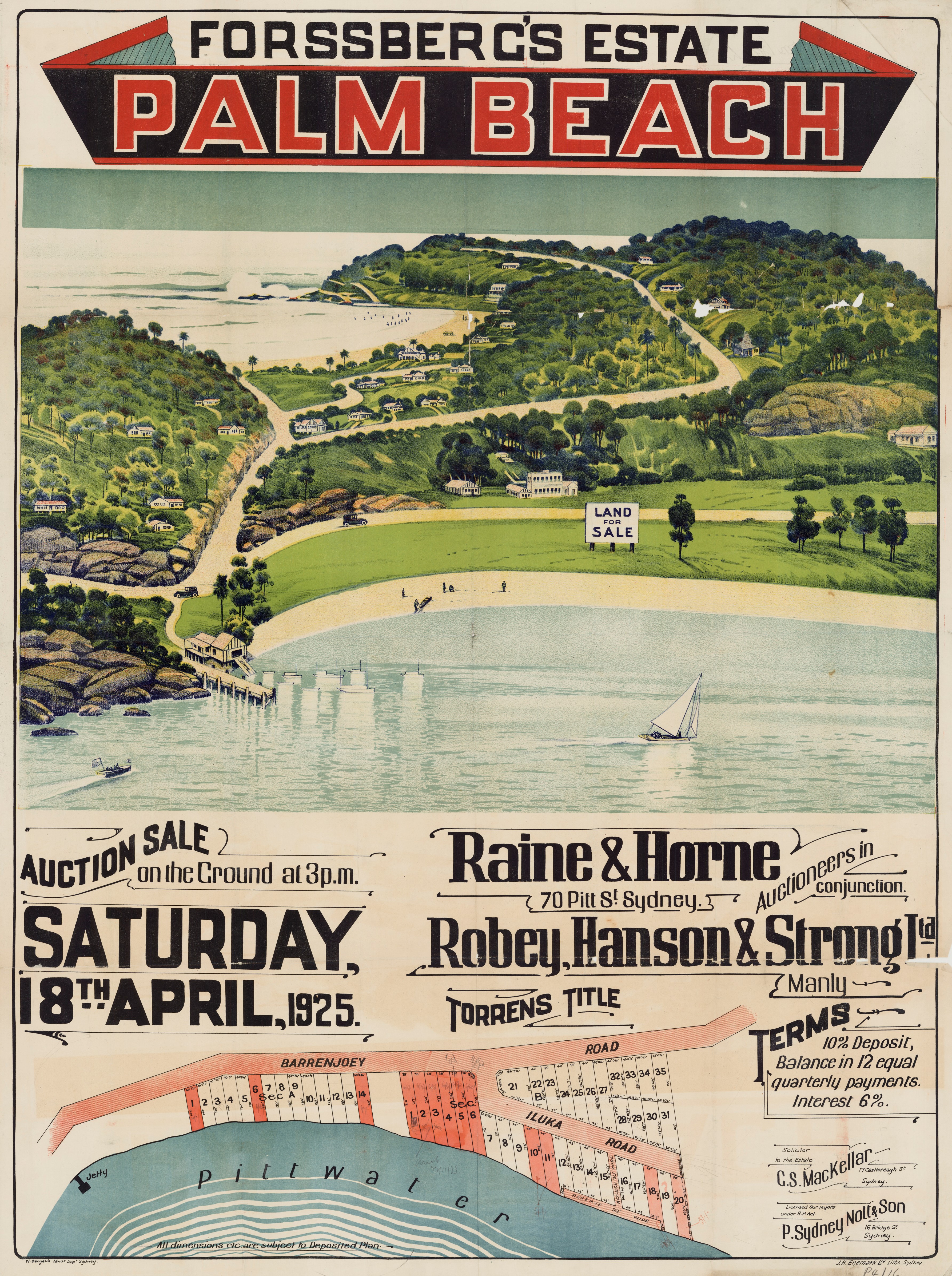 Section from a RAHS photo showing Palm Beach Estate Barranjoey advert circa 1912. Item: c16402_0008_c , courtesy State Library of NSW