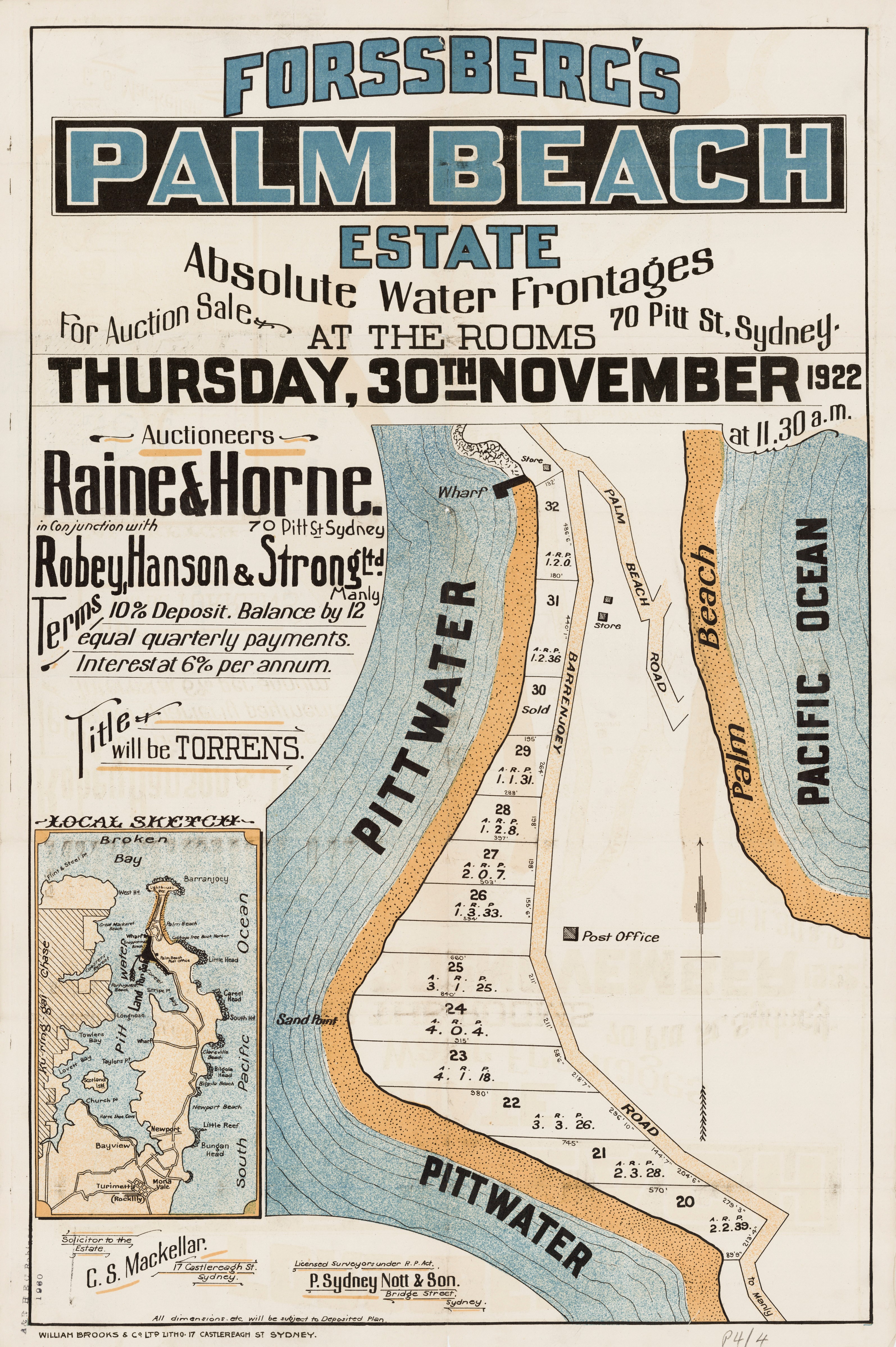 None of the larger sections sold apart from 30 acres on the estuary side which was purchased by Charles John Edward Forssberg, and registered as such in August 1900, and some acres on today's Whale Beach, purchased by soon to be Newport resident Trevor Jones: