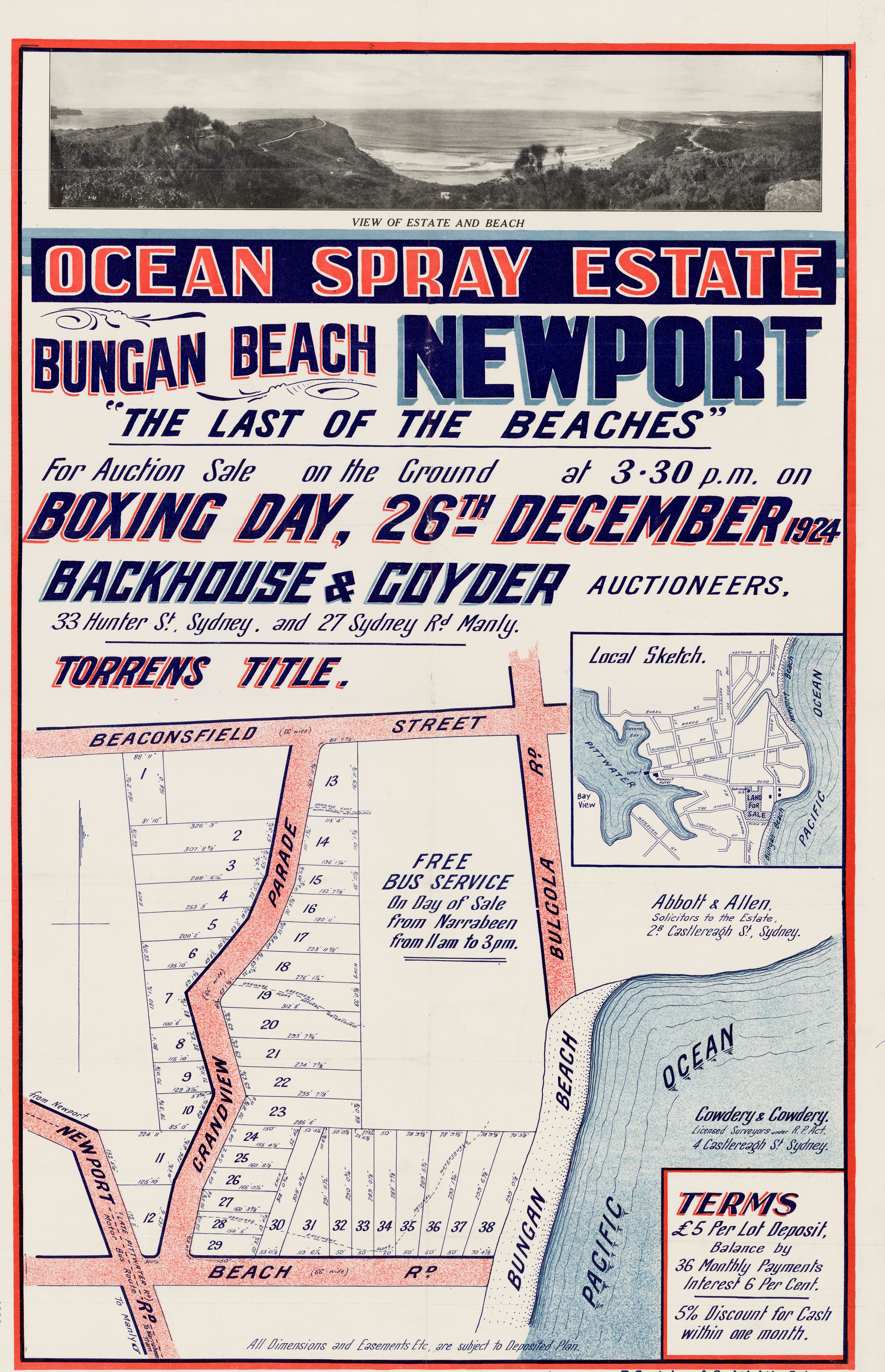 By 1891 the bulk of Bungan Beach and to the estuary side (Mona Vale and Newport) was under the control of the Mona Vale Land Company. The Mona Vale Land Company land was subdivided and sold in a number of sections.