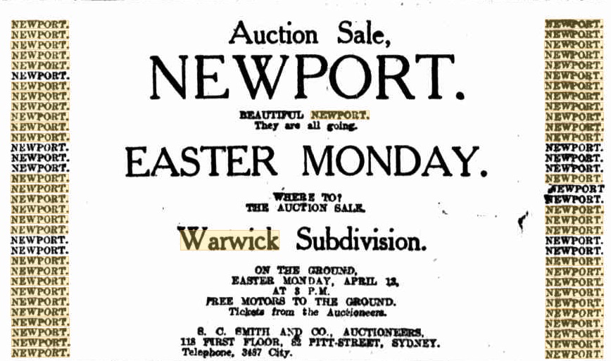 Messrs. Mills and Pile have sold by auction and private contracts in last report the following properties, vix - .... Mrs Warrington, 80 allotments, Newport, Pittwater, £150 PROPERTY SALES. (1883, June 23). The Sydney Morning Herald (NSW : 1842 - 1954), p. 11. Retrieved from http://nla.gov.au/nla.news-article13537590