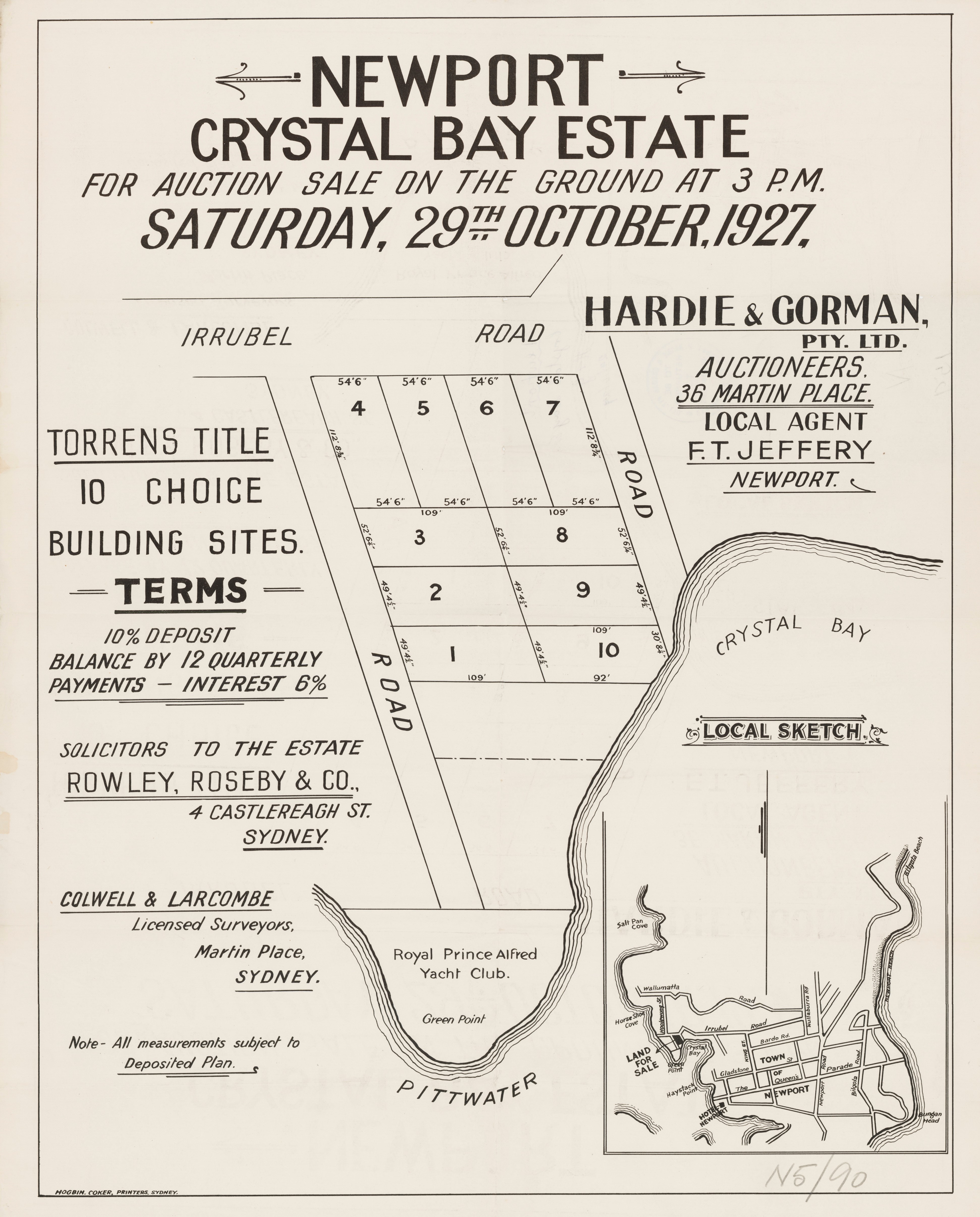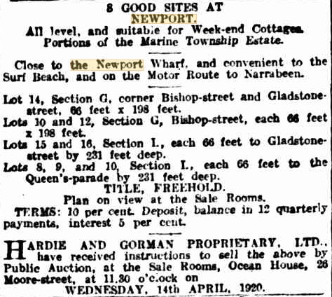 FOR SALE AT THE ROOM'S, 114, PITT-STREET, some FINE BUSINESS SITES in the TOWNSHIP OF NEWPORT, suitable for Hotels and Shops. A good business will be done there before long, Newport being the true PORT OF THE HAWKESBURY. The terms will be £5 deposit on each lot, and the balance 20s per month. Advertising. (1880, November 24). The Sydney Morning Herald(NSW : 1842 - 1954), p. 13. Retrieved from http://nla.gov.au/nla.news-article1348357190