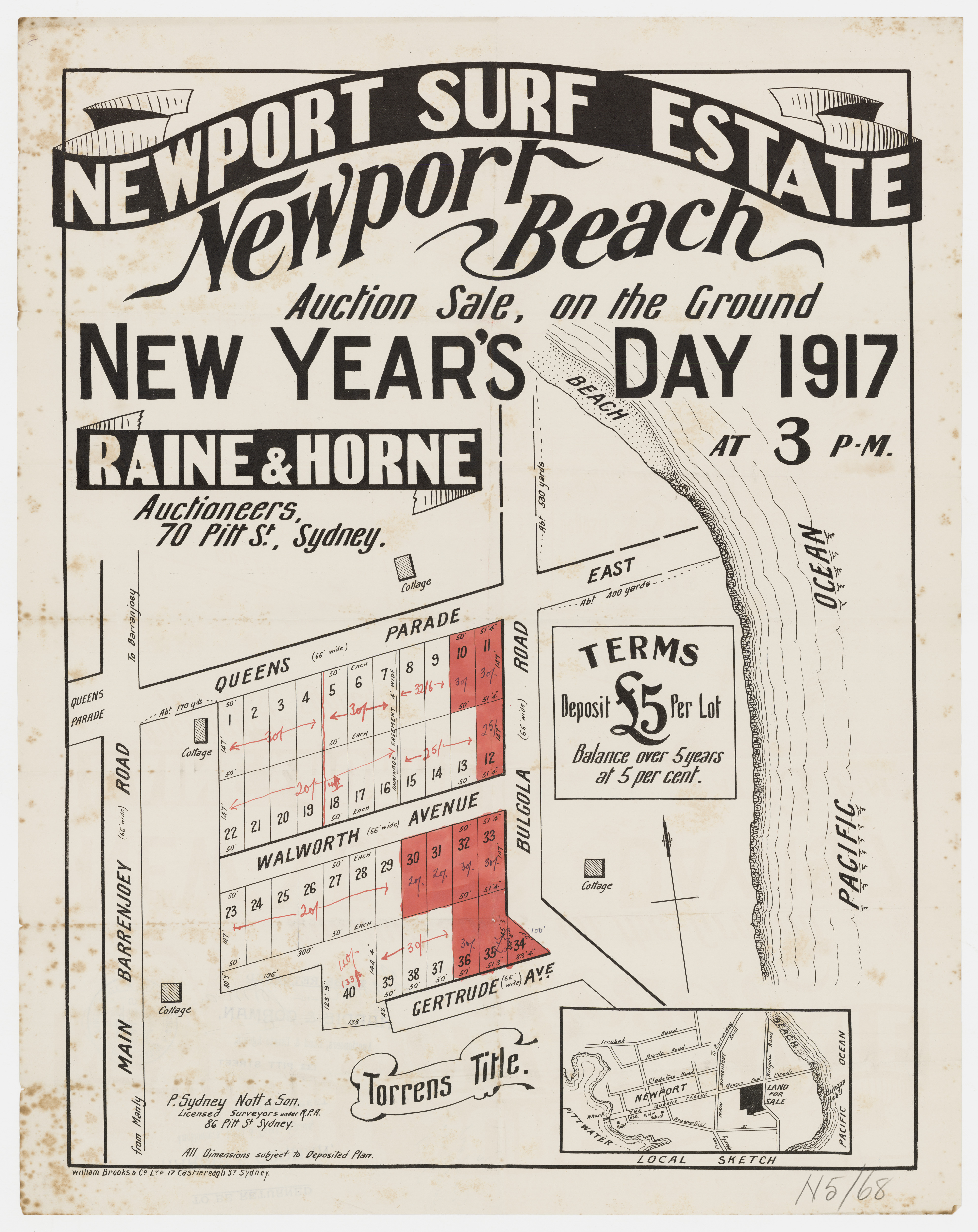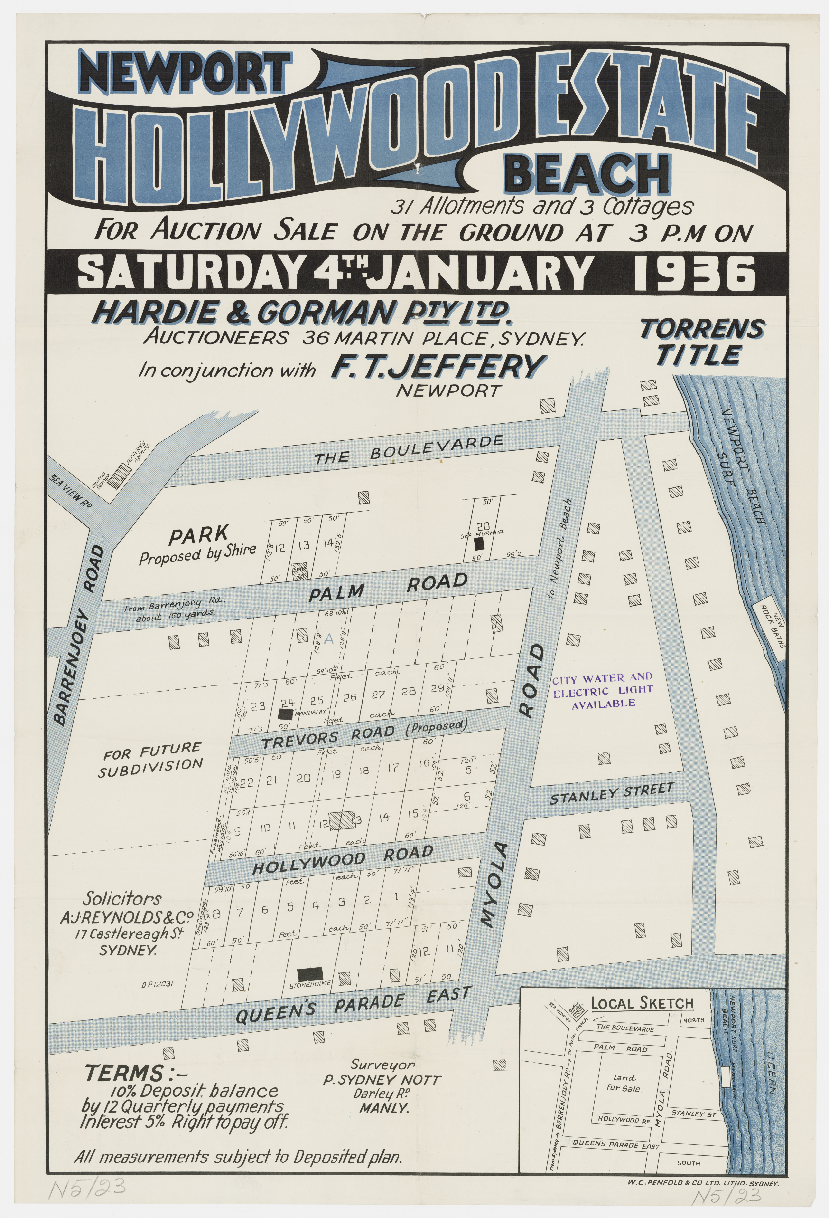 The resumption of Farrell's Newport Beach by Warringah Council established Newport as a holiday resort and ensured land sales would attract those seeking a place by the sea. The first discussions occurred soon after Mr. Farrell brings his Newport paddocks and land under the Real Estate Property Act: