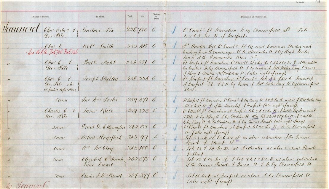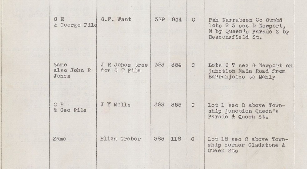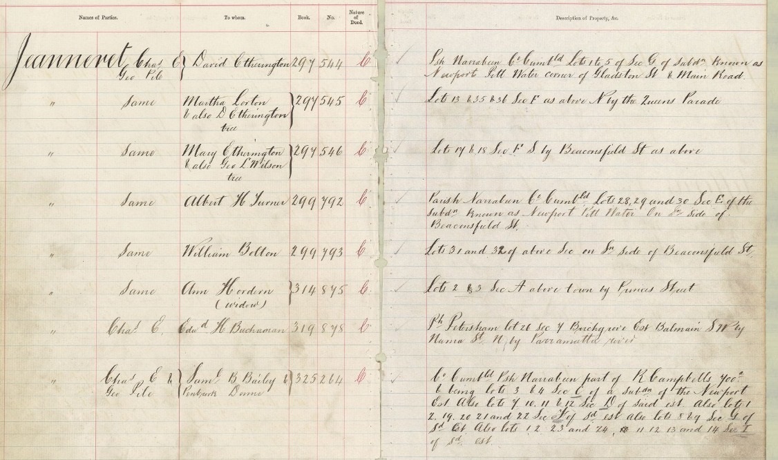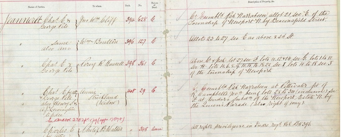 Land buyers at Newport 1880-1890, per HRLV, Charles Jeanerette and George Pile land Sales to Gustave Lix, 1,2 and 3 in Section E, Frederick Fahl, Section E and Section J, Joseph Skellan, Lot 4 to? Section E, John Foster, Lots 8 to 11, Section A, James Rule, Lots 8 to 13, Section A, James Rule (of Ballarat) Lots 8 to 13, Section B, and Lots 5 to 15 & 17 Section C, David G Ethrington, Lot 20, Section E, Alfred Hogsflesh, Lots 23 to 26, Section F, corner of Queens Parade and Stuart Street, William McCloy, Lots 13 and 14 Section D, Elizabeth and Sarah Jane Ewart, Lots 12 and 13, Section A, Lots 9 to 12, Section E, Charles J K Friend, Lot 14, Section L. John O'Dowd, Lots 13 to 16, Section E and Lots 1 and 2 Section C. David Etherington, Lots 1 to 5, Section G, Martha Lorton also D. Etherington, Lots 13, 35, 36 Section F, Mary Etherington also George L. Wilson, Lots 17 and 18 Section F, Albert H Turner, Lots 28 to 30 Section E, William Bolton Lots 31 and 32 Section E, Ann Hordern (widow) Lots 2 and 3 Section A, Samuel Bennet Bailey and Pembrook Denne, Lots 3 and 4, Section C, Lots 7, 10, 11, and 12 Section D, Lots 8, 9, Section G, and Lots 1, 2, 19, 20 and 21 Section F as well as Lots 1, 2, 23, 24, and 11 to 14 Section I. George Frederick Want, Lots 2, 3, Section D, John Russell Jones, Lots 6 and 7 Section G, John Yelverton Mills, Lot 1, Section D, Eliza Greber Lot 18, Section C. John William Cliff, Lot 21, Section E, William Boulton Lots 23 to 27, Section E, Percy R. Russell, Lot 27, Section F, Lots 10, 12 and 14 Section G, Lots 4, 6, 8, 9, 10, 15, 16, 18, 22 Section I, Lots 4 to 18 Section J. Annie Strickland (widow) Lots 28 to 34 Section F inclusive, also right-of-way. Joseph Waterhouse Lot 20, Section I, Patrick Dee, Catherine Dee and also John Navin, Lots 8 to 10 Section F also Lots 15 and 16 Section F.