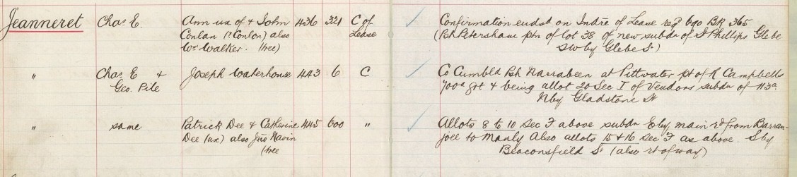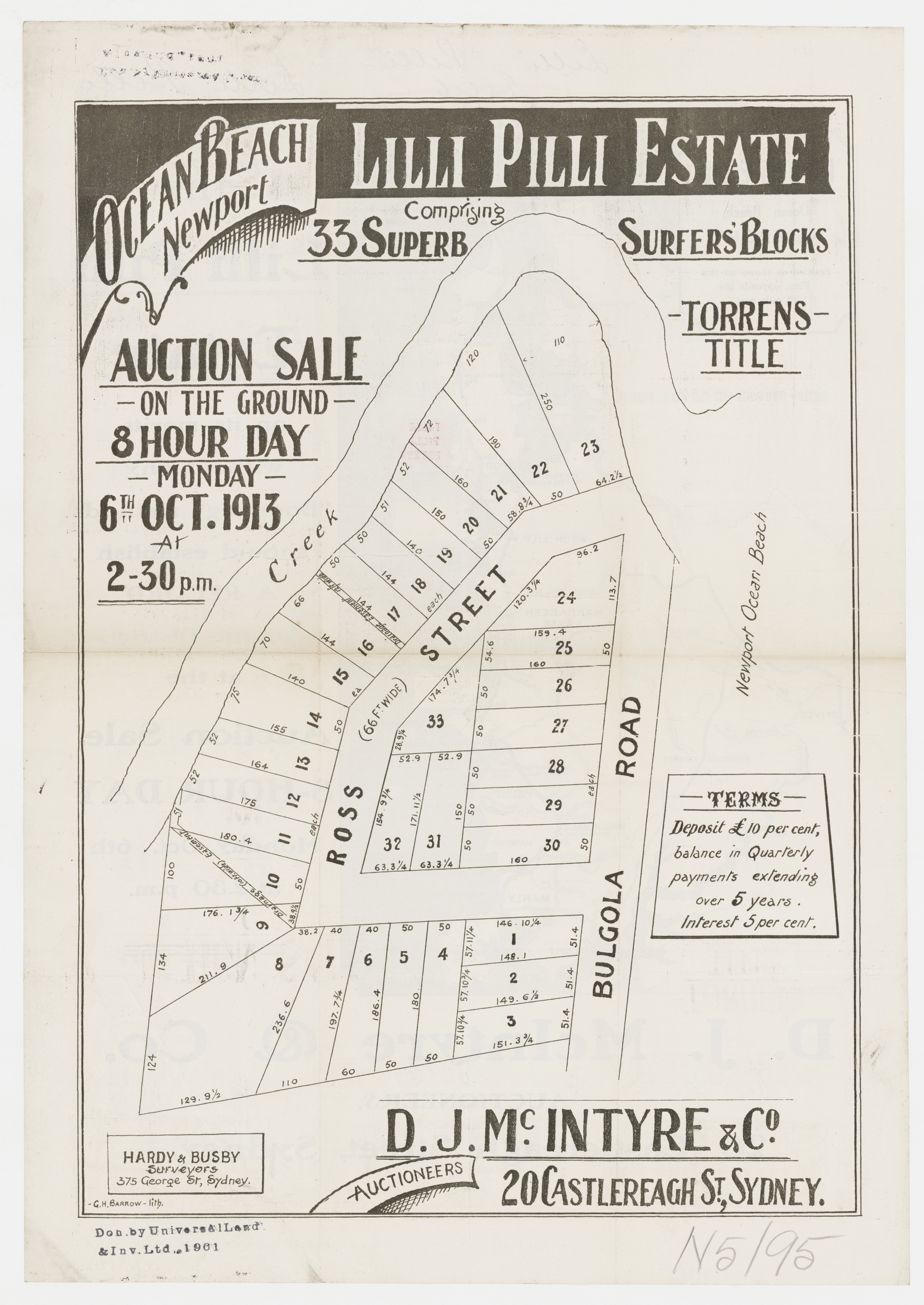 LAND:—County Cumberland, parish Narrabeen, shire Warringah, 132 acres 2 roods, on McMahon's Creek and South Pacific Ocean,— being lands granted as 60 acres (portion 21 of parish) and 30 acres (portion 23 of parish) to John Farrell, and 50 acres (portion 22 of parish) to Martin Burke, and part 50 acres (portion 38 of parish) granted to Robert Henderson, and also part 1200 acres (portion 20 of parish) granted to the Reverend John Joseph Therry, exclusive of the road 1 chain wide from Manly to Barranjoey, the area of which has been deducted from the total area; adjoining properties of M. Dowling and A. M. Bowman, P. J. Shopee, J. Stevenson, W. C. Woolcott, G. Skinner, J. H. Slater, S. Oliver, M. Eason, J. McGlynn, A. Middows, New South Wales Realty Co., W. S. de Wilde, and H. M. Malcolm and Crown Land. NOTICE UNDER REAL PROPERTY ACT. (1910, February 23). Government Gazette of the State of New South Wales (Sydney, NSW : 1901 - 2001), p. 1112. Retrieved from http://nla.gov.au/nla.news-article227062930