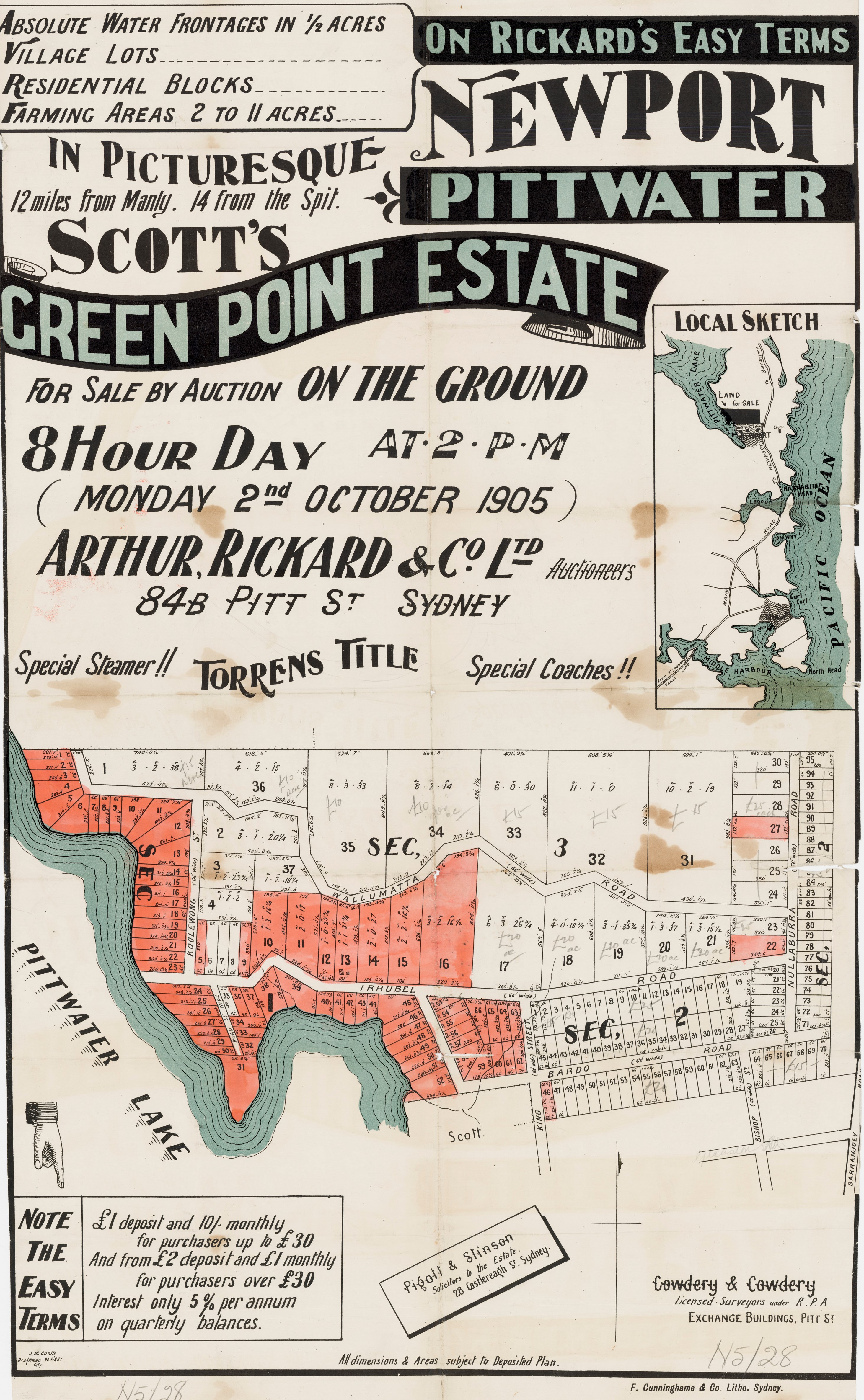 Messrs. Arthur Rickard and Company Limited, will hold an auction sale at Newport on Monday next, (Eight-Hour Day). This fine estate is known as Scott's Green Point, Comprising 197 absolute water frontage lots, without reservation, over half an acre each, and rich farm blocks of two to eleven acres,- and will be submitted to public competition. Pittwater is indeed a healthy holiday resort, the scenery is very fine and visitors can enjoy the ;pure air; 'boating, bathing, fishing, etc. It is confidently expected that when the motor 'buses start running. Newport will boom. That well-known landmark— Scott's Green Point, a picturesque little peninsula which juts out from about the centre of the estate, is among the water frontages to be sold, and is sure to cause big competition at the sale. The terms are liberal. Special steamer and special 'buses are provided for the convenience of visitors. Full particulars will be found in our advertising columns. LAND SALE AT NEWPORT. (1905, September 28). Evening News (Sydney, NSW : 1869 - 1931), p. 3. Retrieved from http://nla.gov.au/nla.news-article114465134