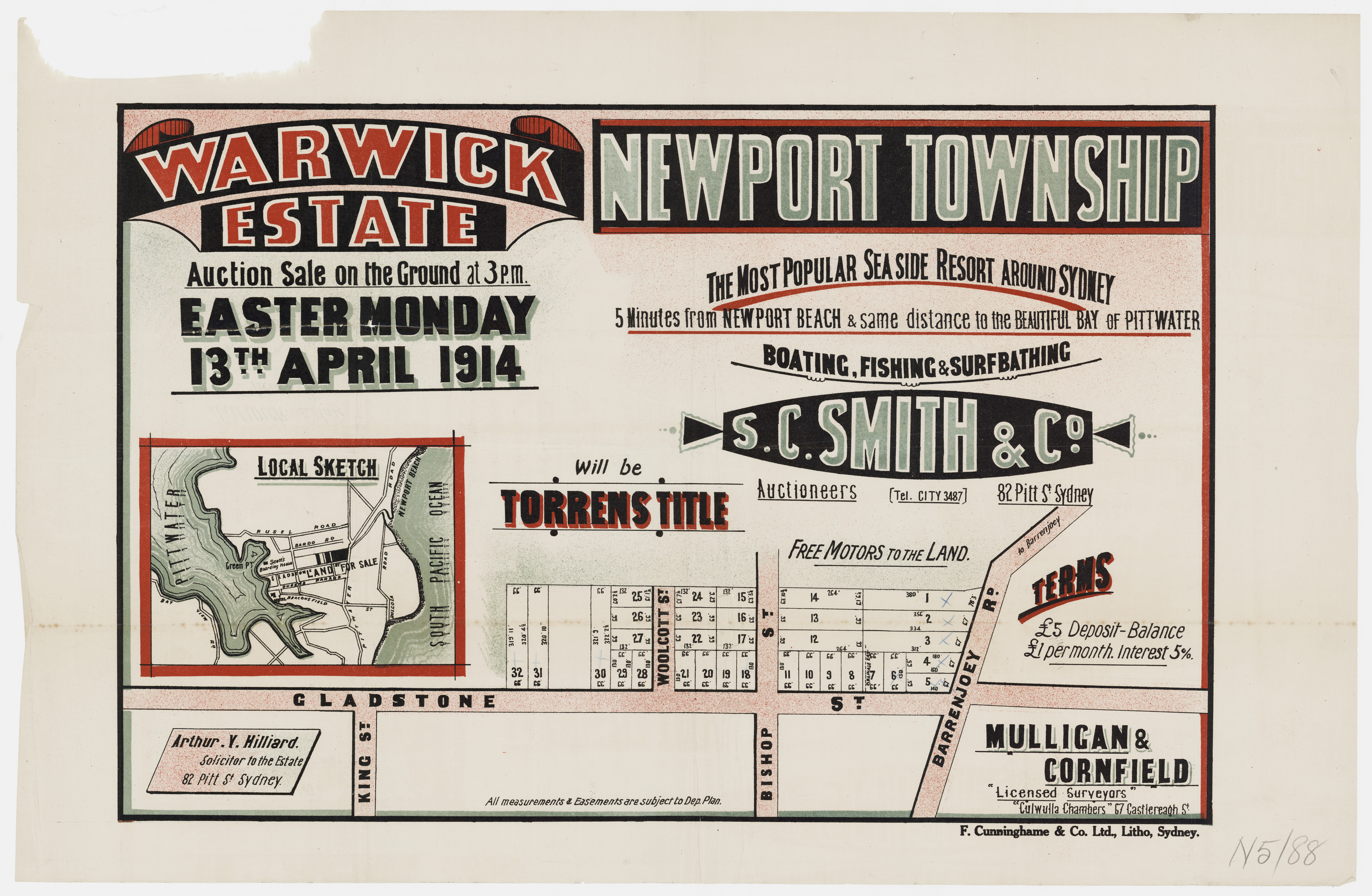 PRINCE OF WALES BIRTHDAY. SALE OF ALLOTMENTS IN THAT CHARMING SANATORIUM, NEWPORT, THE LOVELIEST SPOT IN AUSTRALIA.DON'T FORGET TO ATTEND THE SALE, THE TOWNSHIP IS LAID OUT ON A GRAND SCALE. THE MAIN-STREET IS 2 CHAINS WIDE. Call for a Lithograph, MILLS, PILE, and GILCHRIST, Auctioneers. PRINCE OF WALES BIRTHDAY. THE GREAT SALE of the SEASON. THE MOST GLORIOUS PICNIC. THE GREAT SALE of the NEW WATERING PLACE, NEWPORT. AT THE HEAD OF PITTWATER, CLOSE TO MANLY. THE PORT OF THE HAWKESBURY. REGULAR COACH ACCOMMODATION TO MANLY-. REGULAR COMMUNICATION BETWEEN BRISBANE WATER.THE STARTING PORT of the HAWKESBURY STEAMERS. THE MOST BEAUTIFUL RETREAT in NEW SOUTH WALES. ATTEND THE SALE' on the 9th NOVEMBER. PRINCE OF WALES' BIRTHDAY". THE FIRST SALE OF ALLOTMENTS IN THE NEW MARINE TOWNSHIP OF NEWPORT. MILLS, PILES and GILCHRIST will sell by public Auction, on the GROUND, NOVEMBER 9th, at 2 p.m . SEVERAL SECTION'S IN THAT MOST PROMISING TOWNSHIP, which possesses the following advantages :