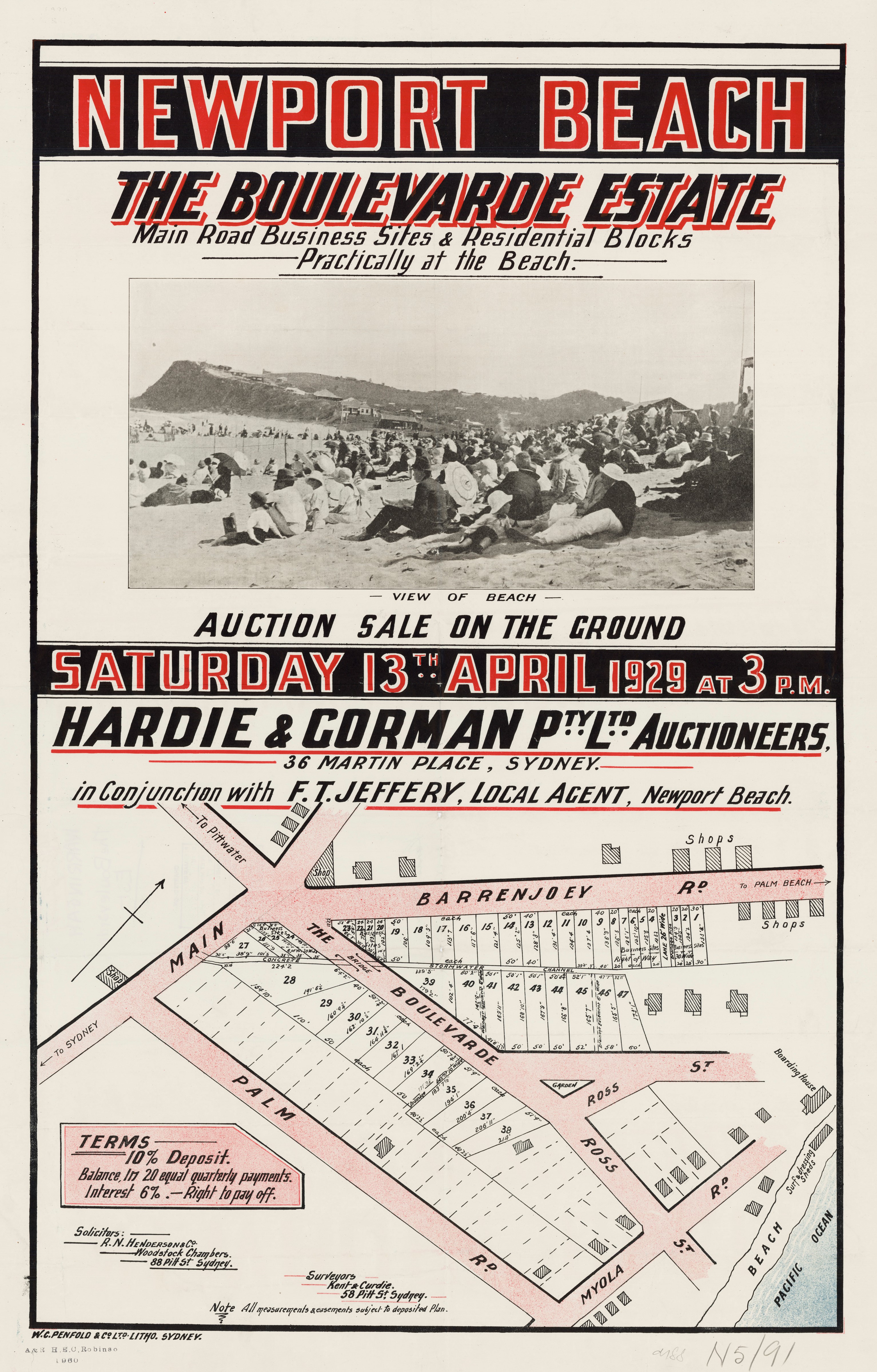 IT IS NEAR a beautiful OCEAN BEACH, at the head of a lovely- bay, between romantic headlands. It has extensive frontage to the deep waters of PITTWATER LAKE. THE LINE of STEAMERS for-BRISBANE WATER and the Hawkesbury start from the NEWPORT WHARF. THE SCENERY is beautiful in the extreme, the views from the adjacent mountains are most extensive, the vegetation superb. IT WILL he the head centre of YACHTING and FISHING PARTIES. AS A PROOF of its prospects, it may be mentioned that although the HOTEL (now an accommodation house only, until a license is got for it) has only been occupied ONE MONTH, yet the tenant has made APPLICATION for 12 additional rooms, and offered to contribute to the cost of the same. THE PROPRIETORS have so high an opinion of the FUTURE of NEWPORT, that they have decided to sell only a portion thereof, and hold the remainder for some years to come. ATTEND THE SALE. LIBERAL TERMS. LITHOGRAPHS NOW READY. Advertising. (1880, November 5). The Sydney Morning Herald(NSW : 1842 - 1954), p. 10. Retrieved from http://nla.gov.au/nla.news-article13478153