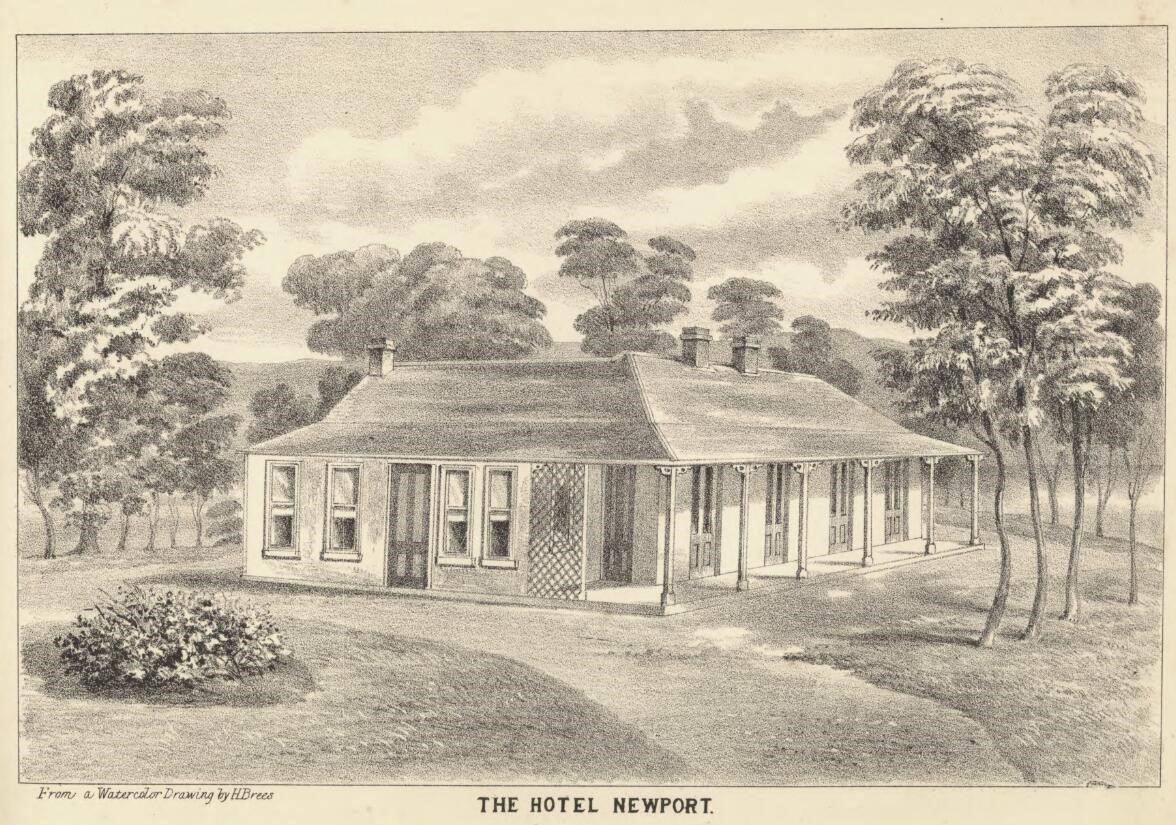 Newport Hotel, from album Pittwater scenes, 1880 / Harold Brees courtesy State Library of NSW - note the Telegraph wires. The drawings appear to be the originals for six of the lithographs illustrating 'The Pittwater and Hawkesbury Lakes album'. [Sydney] : Mills, Pile & Gilchrist, 1880. (Lithographed by S.T. Leigh & Co.)courtesy State Library of NSW