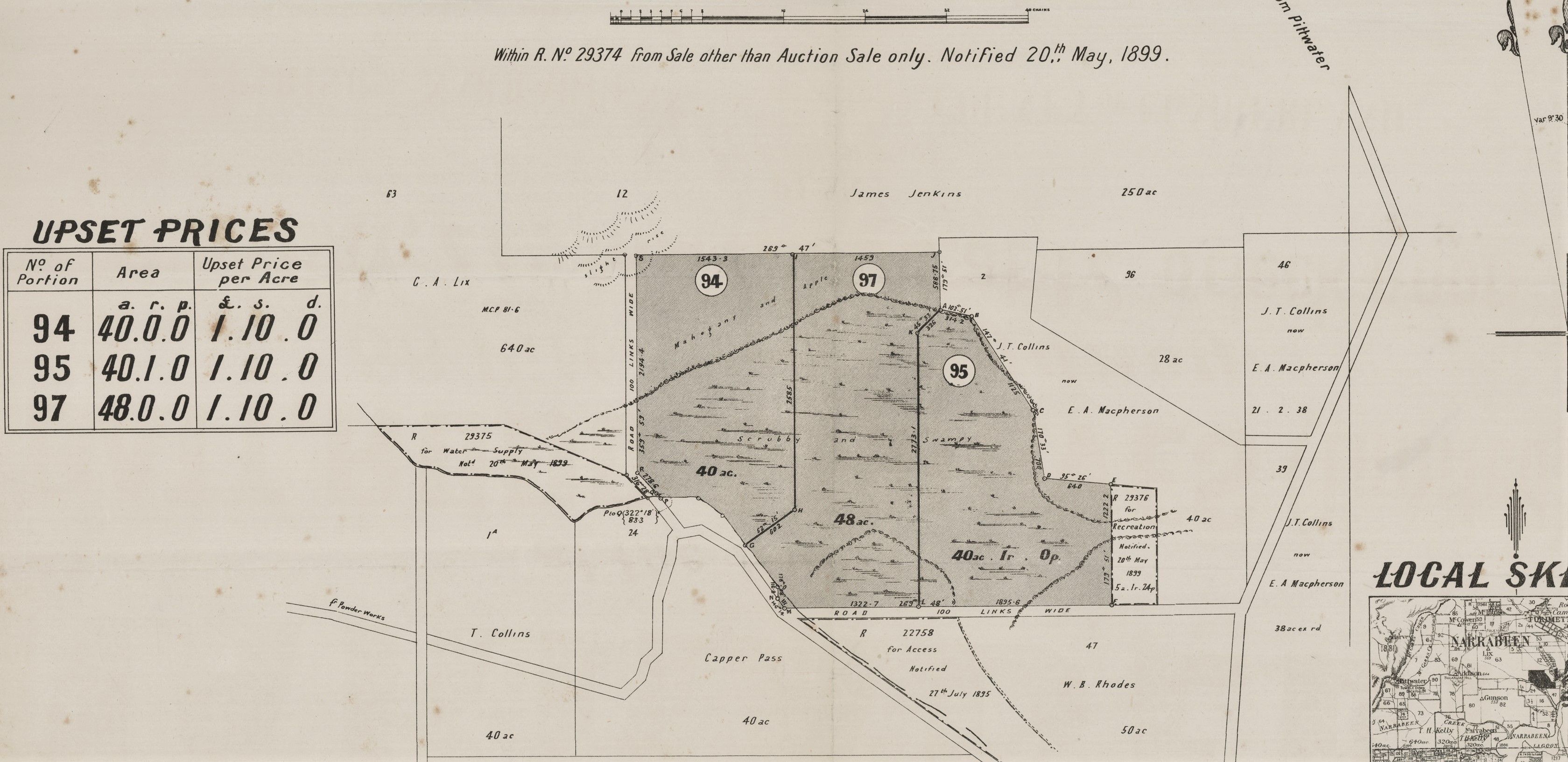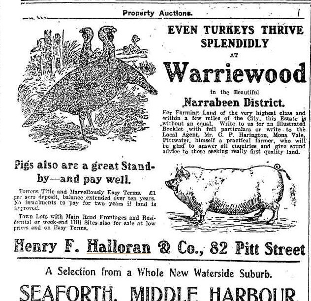 Access meant the large blocks of acreage may attract investors. David Moore, who also had a 100 acre holding sold as the 'Narrabeen Heights Estate' on the way to Collaroy, appears among the earlier sales, as does the Jenkins 350 acre holding in 1886: