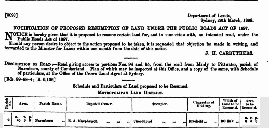 Manly to Pittwater road,—parts 50 acres (portion 47 of parish), granted to William Bernard Rhodes; adjoining property of J. T. Collins. NOTICE UNDER REAL PROPERTY ACT. (1912, June 12). Government Gazette of the State of New South Wales (Sydney, NSW : 1901 - 2001), p. 3668. Retrieved from http://nla.gov.au/nla.news-article221608288