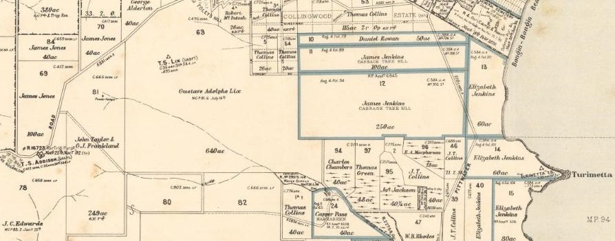 250 acres granted to James Jenkins on 19 October 1831, to be called "Cabbage Tree Hill" (LTO SN 30 129)
