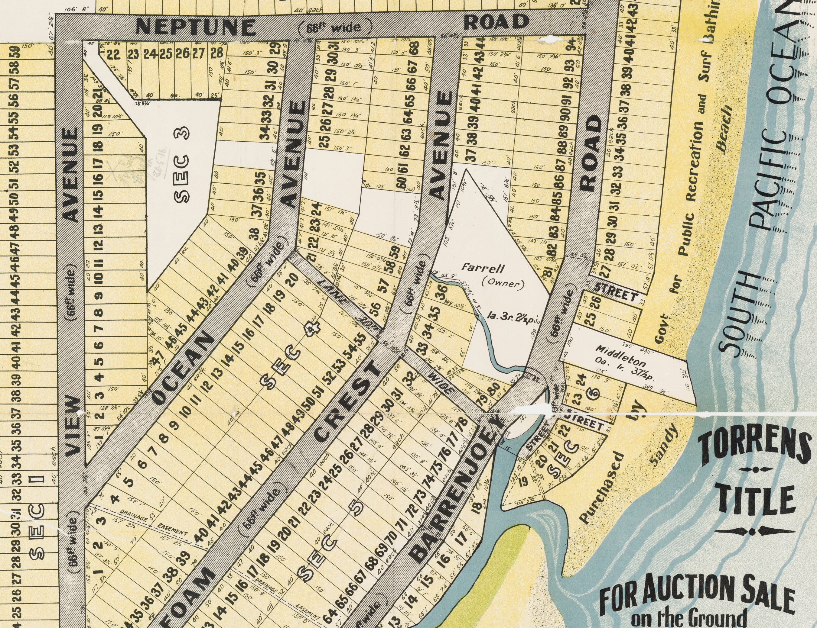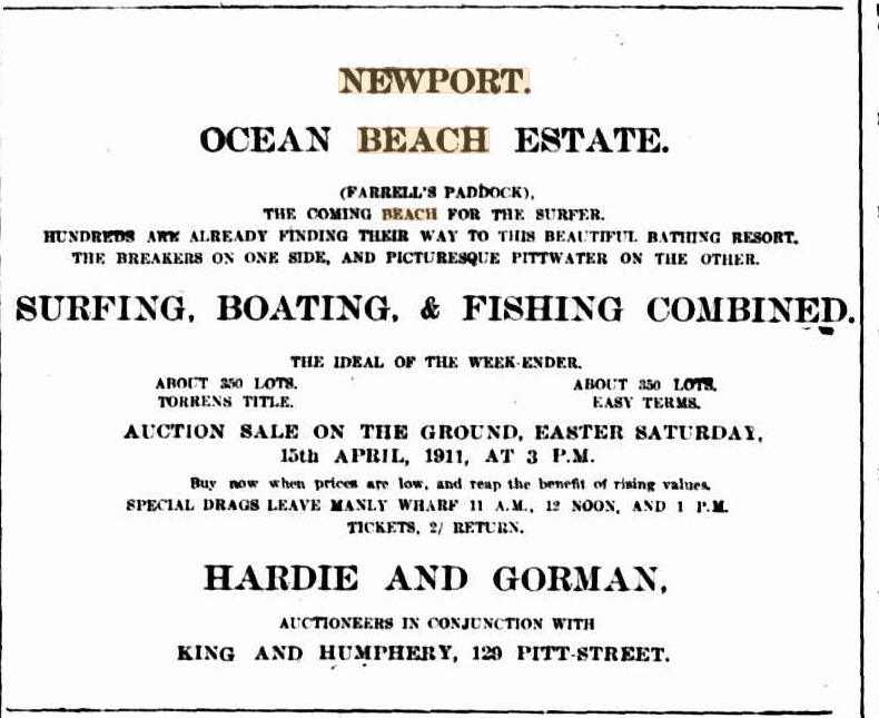 Farrell’s paddock – Ocean Beach Estate sale: Advertising (1911, April 1). The Sydney Morning Herald (NSW : 1842 - 1954), p. 20. Retrieved from http://nla.gov.au/nla.news-article28140750