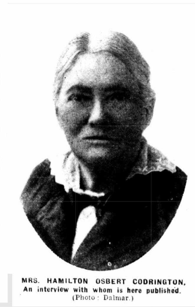 Here is an interview with Mrs. Hamilton Osbert Codrington, who recently celebrated her 78th birthday. She was formerly Miss Emma West, her father eing the late Rev. John West, who was for many yearsd Editor of the ‘Sydney Morning Herald’.
