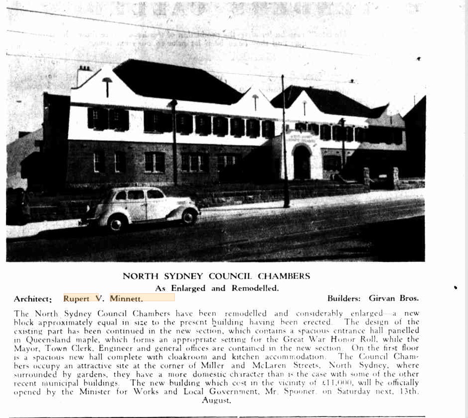 Mr. Minnett gave his time freely to design an Anzac Memorial Hall for North Sydney Council which opened in 1941. He also redesigned their chambers earlier on, among a lifetime of works: